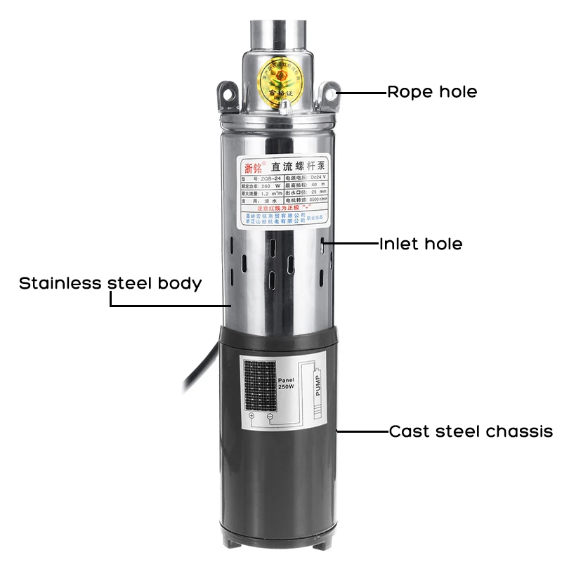 Особенности-Двигатель из чистой меди-Корпус из нержавеющей стали-Безопасная изоляция, сильная мощность-Высокоточное уплотнение-Хороший эффект отключения звука-Подходит для использования на кораблях, рыбацких лодках, рыбных прудах, сельскохозяйственных орошениях и т. д.-Это нетоксичный, не загрязняющий, бесшумный Солнечный водяной насос-Это просты в установке. Он может подключить насос непосредственно к солнечной панели.-Изготовлен из нержавеющей стали и литого стального материала, коррозионной стойкости, термостойкости, высокой температуры.-Высокий Подъем, большой поток, малый размер, легко носить с собой.