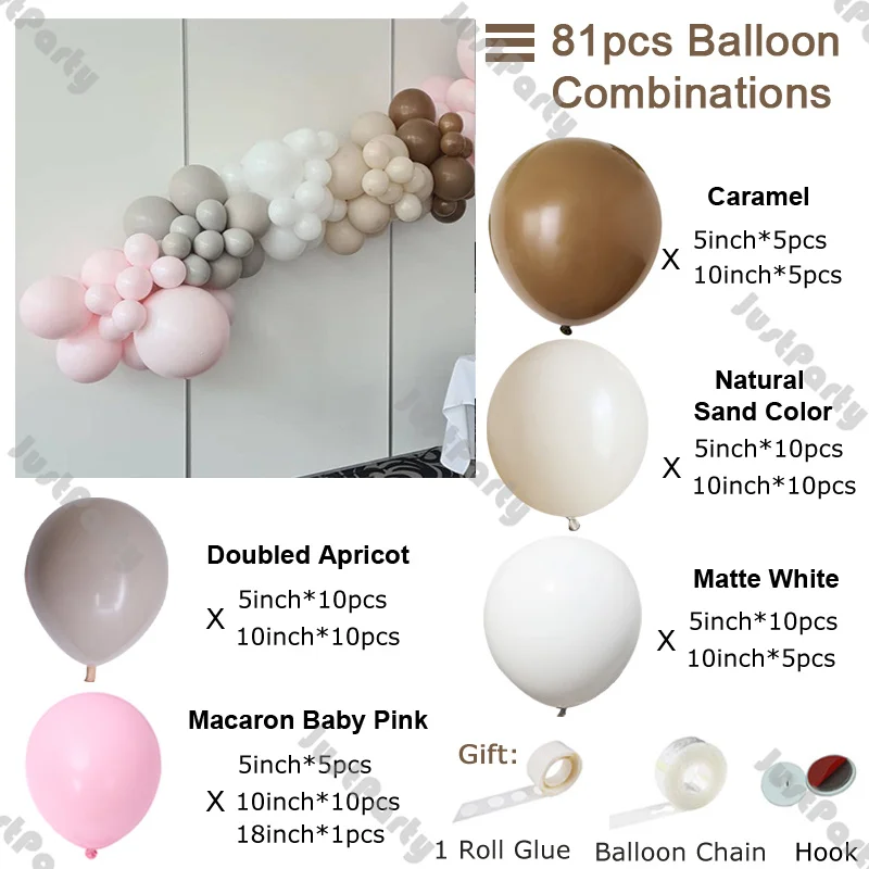 81 шт (7 футов)Шар гирлянда Арка Упаковочный лист:Карамель (5 дюймов * 5 шт., 10 дюймов * 5 шт.)Естественный цвет песка (5 дюймов * 10 шт., 10 дюймов * 10 шт.)Матовый белый (5 дюймов * 10 шт., 10 дюймов * 5 шт.)Абрикосовый (5 дюймов * 10 шт., 10 дюймов * 10 шт.)Macaron Baby Pink (5 дюймов * 5 шт., 10 дюймов * 10 шт., 18 дюймов * 1 шт.)Бесплатно: 1 рулонный клей (100 шт.)Воздушная цепь * 1(5 м), крючок * 3