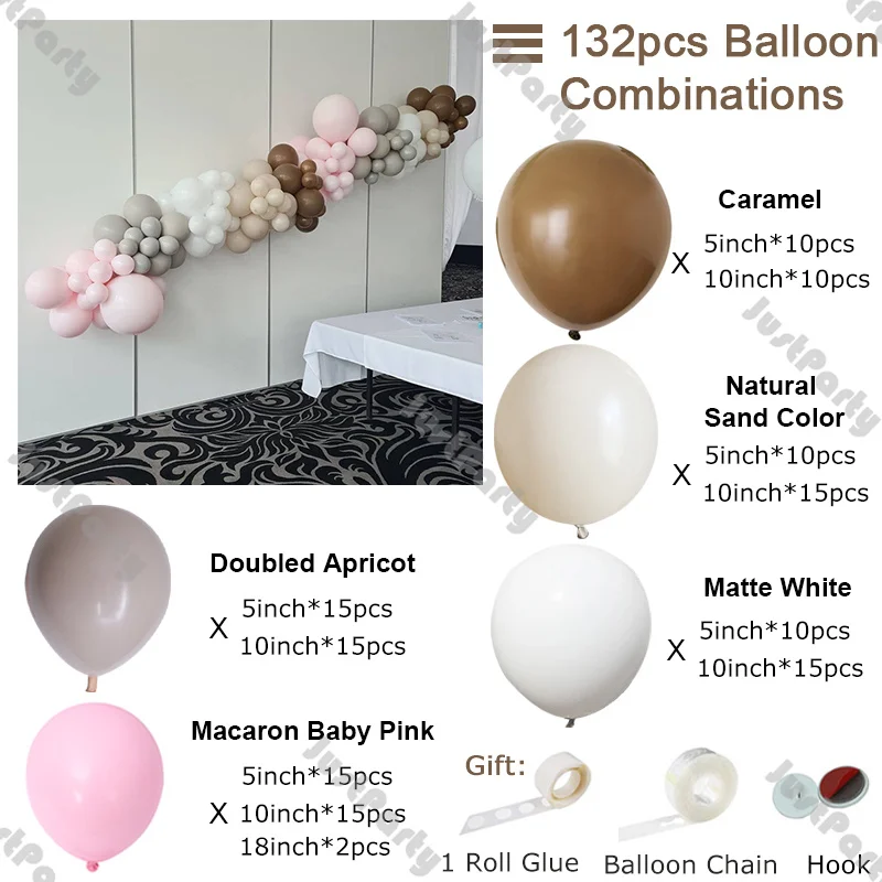 132 шт (12 футов)Шар гирлянда Арка Упаковочный лист:Карамель (5 дюймов * 10 шт., 10 дюймов * 10 шт.)Естественный цвет песка (5 дюймов * 10 шт., 10 дюймов * 15 шт.)Матовый белый (5 дюймов * 10 шт., 10 дюймов * 15 шт.)Абрикосовый (5 дюймов * 15 шт., 10 дюймов * 15 шт.)Macaron Baby Pink (5 дюймов * 15 шт., 10 дюймов * 15 шт., 18 дюймов * 2 шт.)Бесплатно: 1 рулонный клей (100 шт.)Воздушная цепь * 1(5 м), крючок * 3