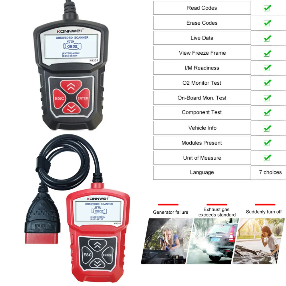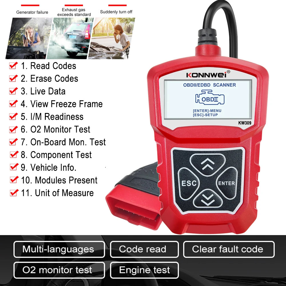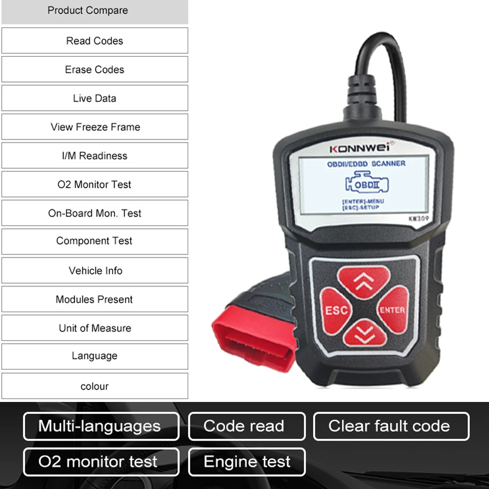 7. Views freeze frame dataThe KONNWEI KW309 OBD2 / EOBD / CAN Car Diagnostic Scanner supports all 10 OBDII test modes on all OBDII compliant vehicles for a complete diagnosis. the KONNWEI KW309 is truly the ultimate in power and affordability, allowing users to do their jobs faster.
