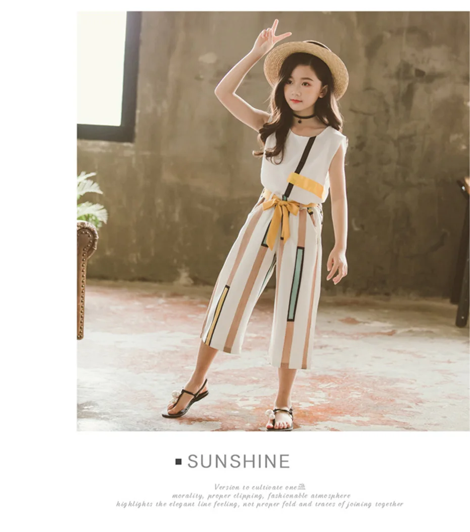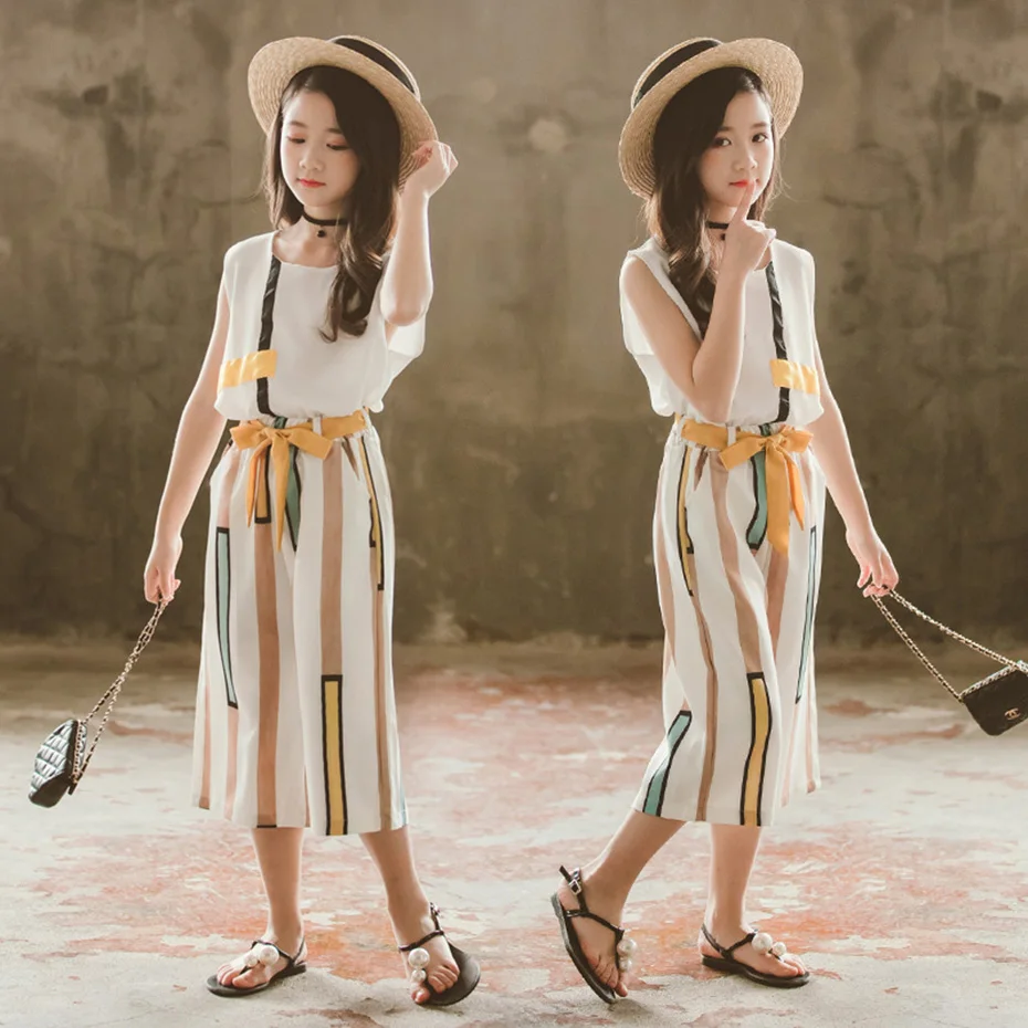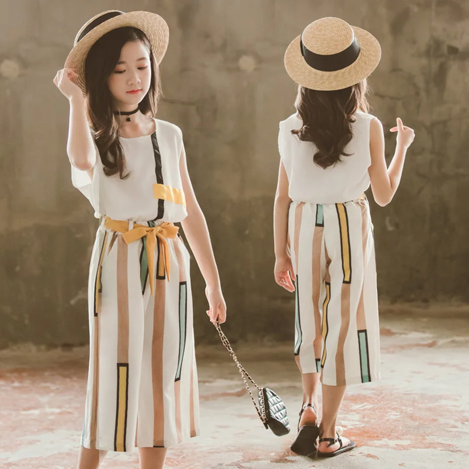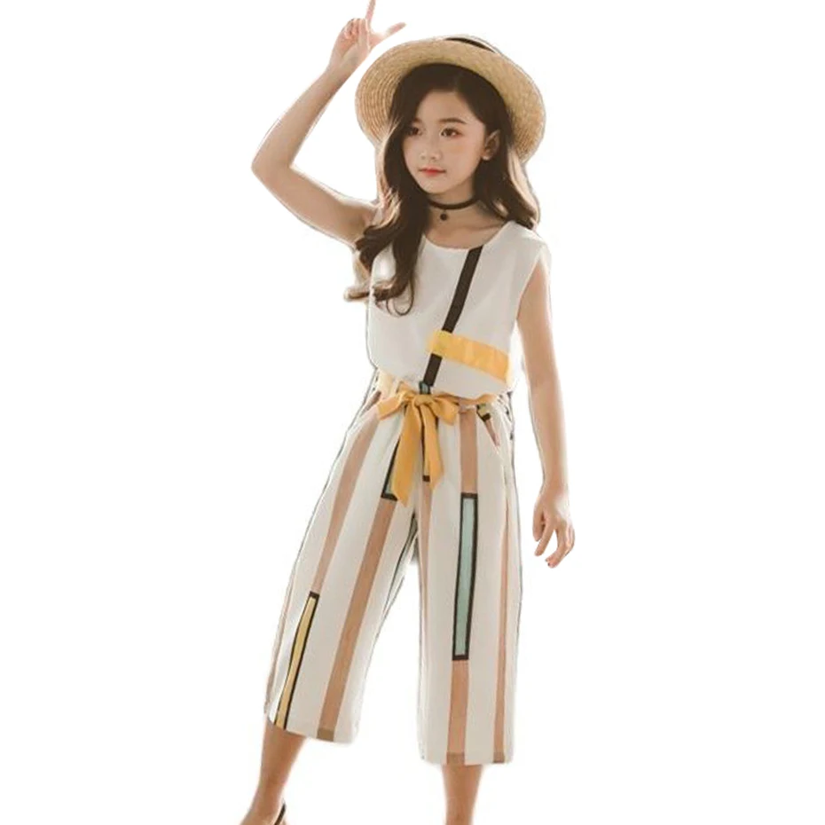 Летняя одежда для девочек, спортивные костюмы в полоску для девочек, жилет + короткая одежда для девочек-подростков, детская одежда