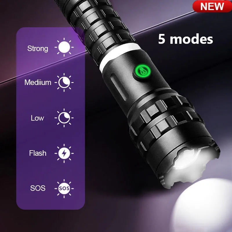 Newly updated design:The flashlight has 5 modes, you can switch to the mode you like at will, and long press any mode for 3.5 seconds to turn off the flashlight; 《Convenience》IPX6 waterproof rating, the flashlight can be used normally in extreme weather such as heavy rain, hail, haze, haze, etc. 《high quality》The ultra-long irradiation distance of 1700 meters allows you to bring you a new experience!《Super Bright-Long Illumination Range》