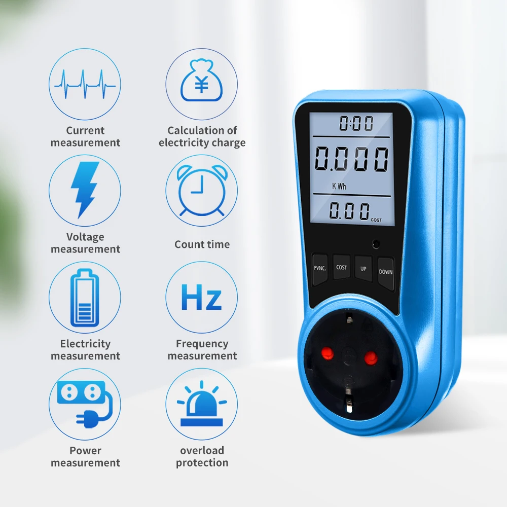 8. Измерьте различные параметры + Функция защиты от перегрузки: мощность (Вт), энергия (кВтч), вольт, ампер, герц, коэффициент мощности и Максимальная мощность (Вт), время, дней (ваш счет за электричество в основном основан на кВтч).