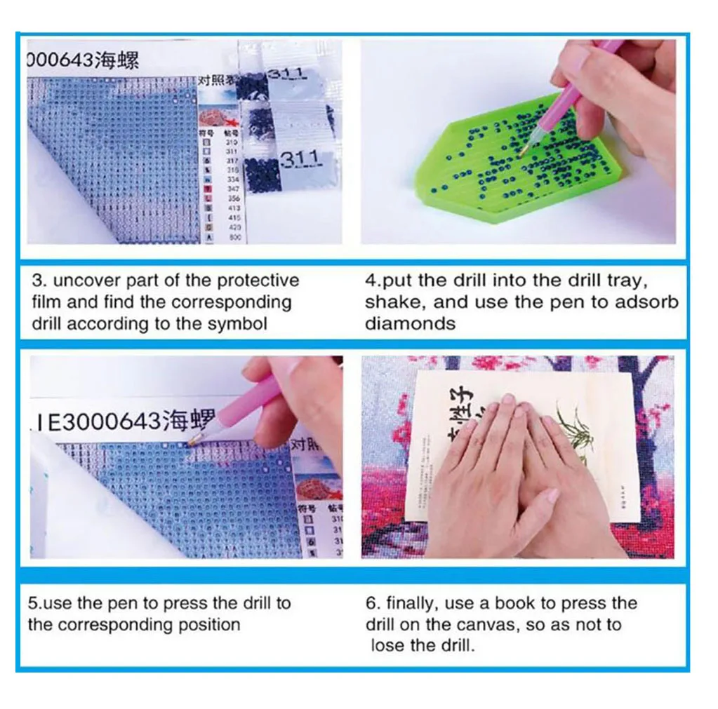 A. Open the parcel and take out all diamonds.B. Adhere a little glue to the top of the pen.C. Find the corresponded diamonds using check-list embroidered on the side of canvas.D. Lift diamonds with drill pen.E. Put diamonds onto correct place marked on canvas.F. Press the finished part,make sure it is strongly attached.G. Roll up the finished painting and face out the front par.H. After finishing,you can use suitable frame to frame and hang on the wall