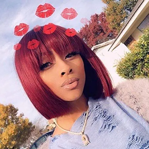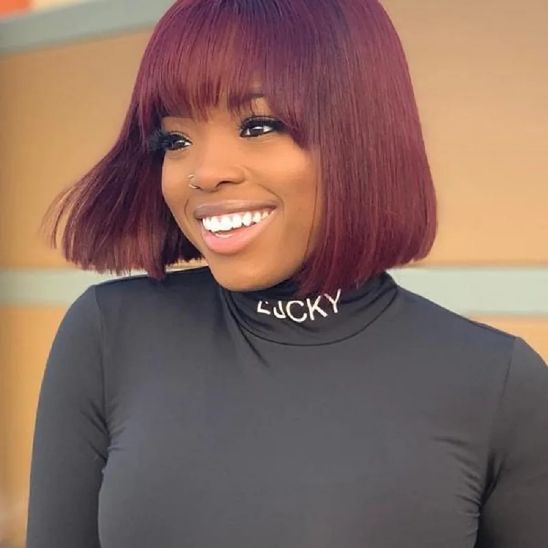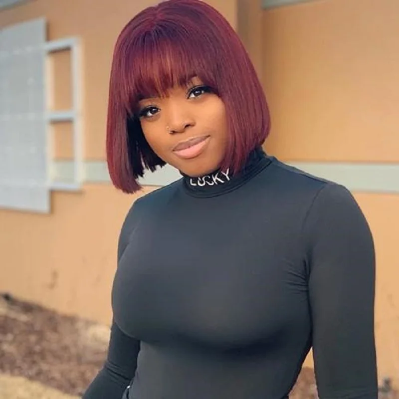 парики женские 99J красный бордовый короткий парик из человеческих волос с бахромой для женщин, парики боб с челкой, прямые бразильские волосы Remy темно-коричневого цвета
