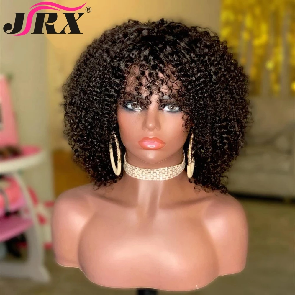 Парик с кудрявыми человеческими волосами с челкой, без клея, полностью машинное изготовление, бразильский короткий парик с короткими вьющимися волосами, для женщин, волосы с неповрежденной челкой
