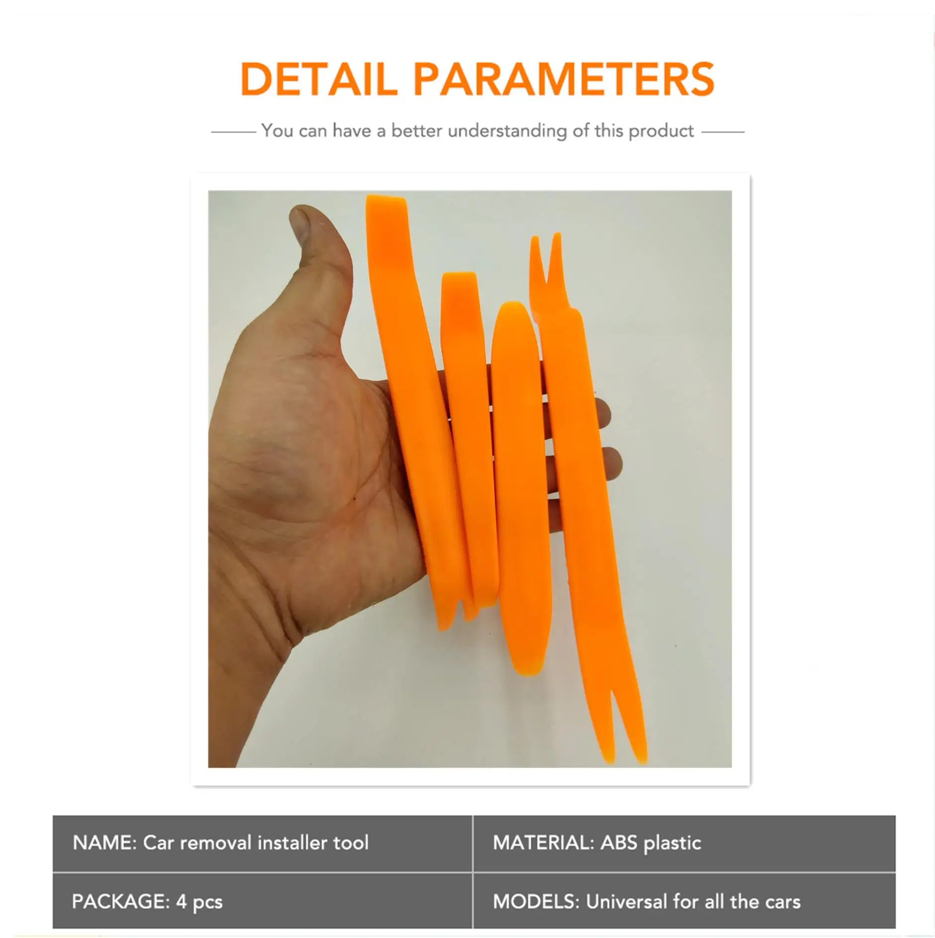 1 Набор инструментов для удаления панели автомобиля (включая 4 шт.)Полезный инструмент для безопасного удаления и установки автомобильного аудио, внешней и внутренней отделки, приборной панели, дверной панели, чтобы не царапать ваш автомобильИнструмент может эффективно уменьшить вогнутые и выступающие шрамы, оставленные с помощью винтового ножа для удаленияЭто может уменьшить возможность истирания внутреннего украшения автомобиляИнструменты предназначены для любой модели автомобиляЦвет: оранжевыйМатериал: пластикПосылка включает в себя:1 x набор инструментов для удаления панели автомобиля (4 шт./компл.)