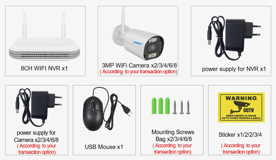 1 * 8CH Wifi NVRWifi камера 2/3/4/6/8 * 3MP(В соответствии с вашим вариантом сделки)1 * Адаптер питания для NVR2/3/4/6/8 * Мощность адаптер для Камера(В соответствии с вашим вариантом сделки)1 * USB мышь2/3/4/6/8 * крепежные винты сумка(В соответствии с вашим вариантом сделки)1/2/2/3/4 * Стикеры(В соответствии с вашим вариантом сделки)