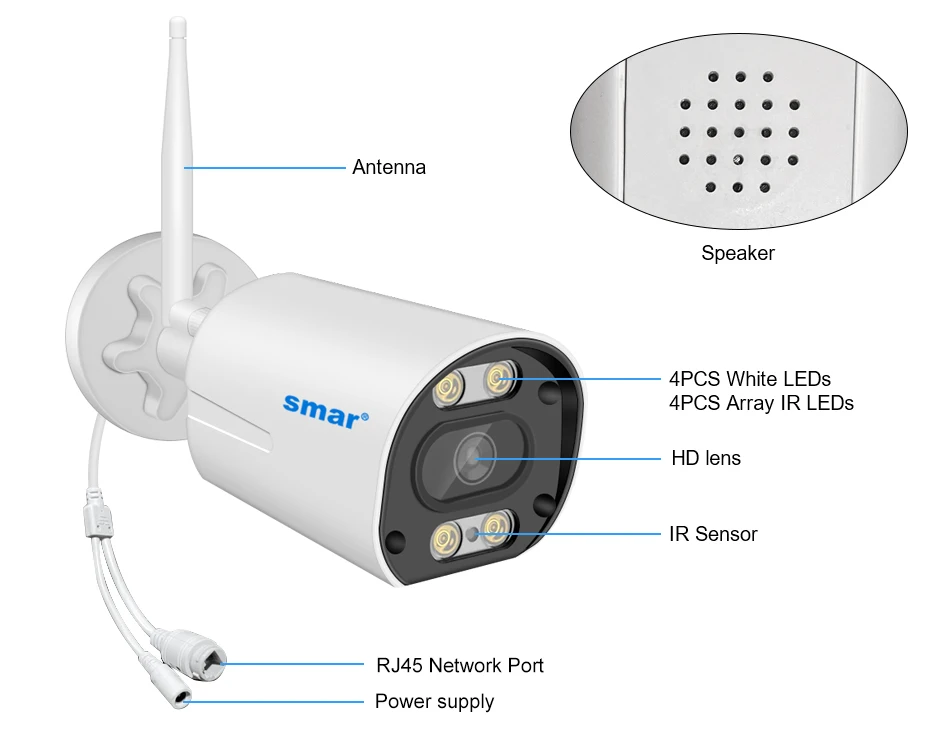 Датчик изображения: HD Цвет CMOS.Разрешение изображения: 2048*1536PОбъектив: 3,6 мм HD Мега Пиксели линзы.ИК Ночное Видение: Он имеет 4 шт. двойной светильник wick led и поддерживает три режима (дневное видение, ночное видение, полноцветное ночное видение, ИК-расстояние: 10-20 м), при обнаружении движения, включите режим полного цвета ..Защита от атмосферных воздействий: Да (IP66).Встроенные динамики и микрофоны камеры, двухсторонняя аудио функция;Минимальная освещенность: цвет 0,1 люкс, B/W 0.01Lux2/3/4 x Красочные CMOS 2.0MP ИК-светодиоды ip-камеры для опции.
