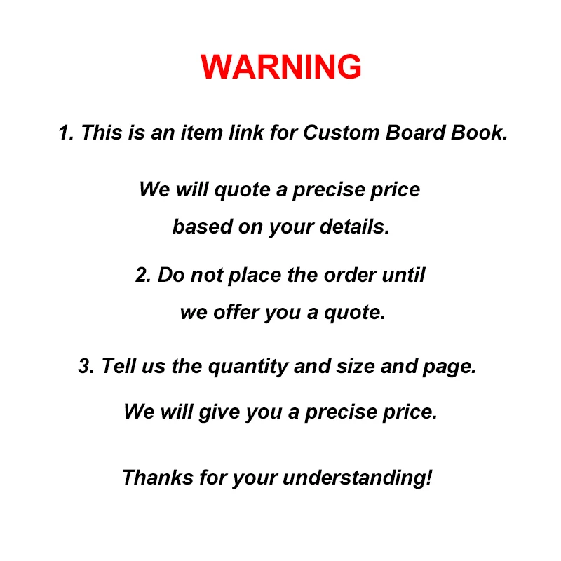 Это ссылка на товар для пользовательской книги. Мы предложим точную цену на основе ваших деталей.Не размещайте заказ, пока мы не предложим вам предложение. Сообщите нам количество и размер и страницу. Мы дадим вам точную цену. Спасибо за понимание.(Не размещайте заказ на 1 долл. США, цена не составляет 1 долл. США за книгу, мы не можем сделать заказ без кавычки для вас. Спасибо!)