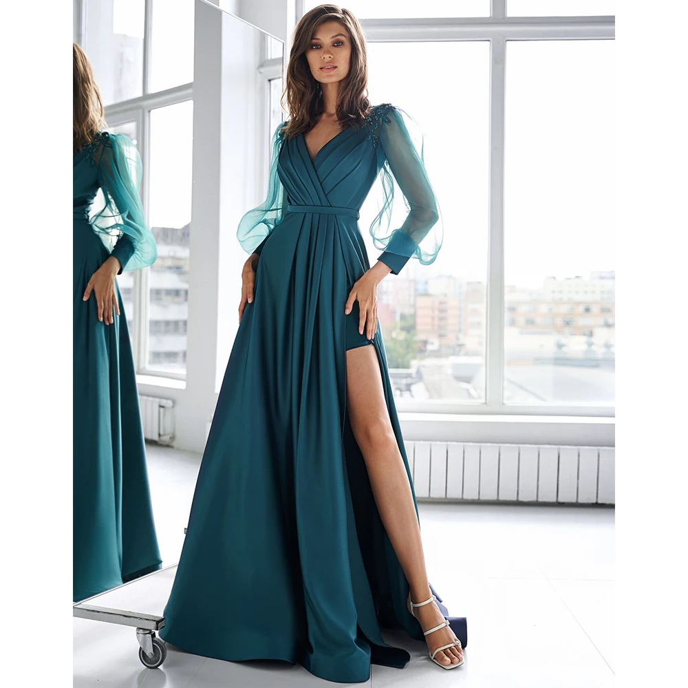 EAEOVN выпускное платье с бисером 2022 ТРАПЕЦИЕВИДНОЕ с V-образным вырезом иллюзионное Тюлевое платье с длинными рукавами до бедра с Разрезом Вечернее платье со складками со шлейфом официальное платье