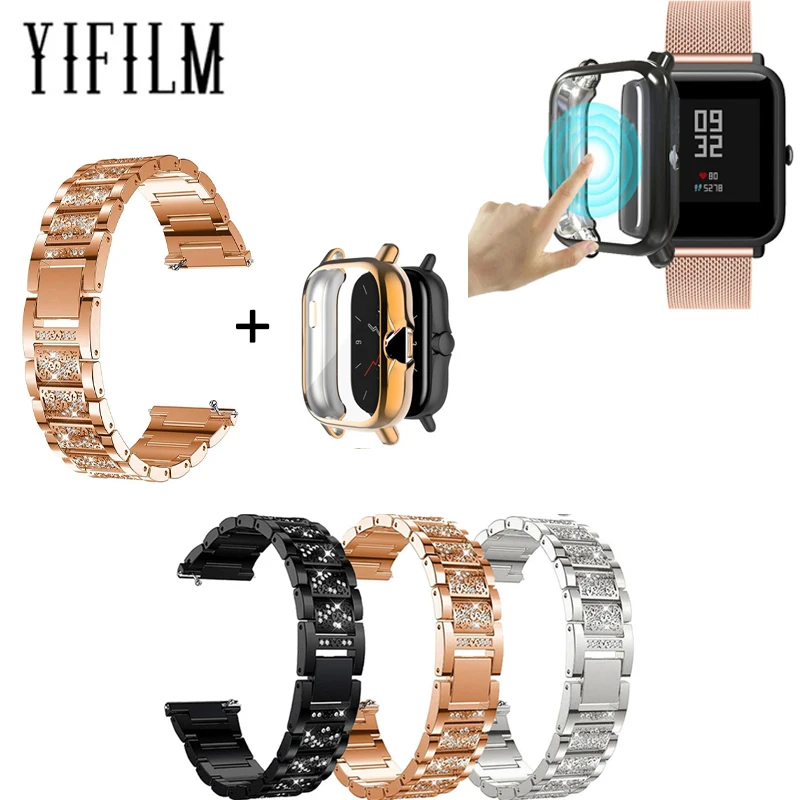 Металлический браслет + чехол для Xiaomi Huami Amazfit GTS 2 Mini Bip U Pro S Lite, ремешок для смарт-часов со стразами, защитный чехол против царапин