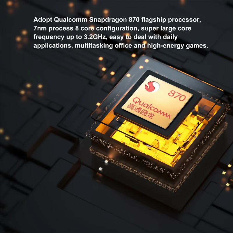 Принять устройство, док-станция Qualcomm Snapdragon 870 флагманский процессор, 7nm процесса 8 ядро конфигурации, супер большой частота ядра с тактовой частотой до 3,2 ГГц, легко справляется с ежедневного применения, многозадачность для офиса и высокоэнергетическая топливная игры.