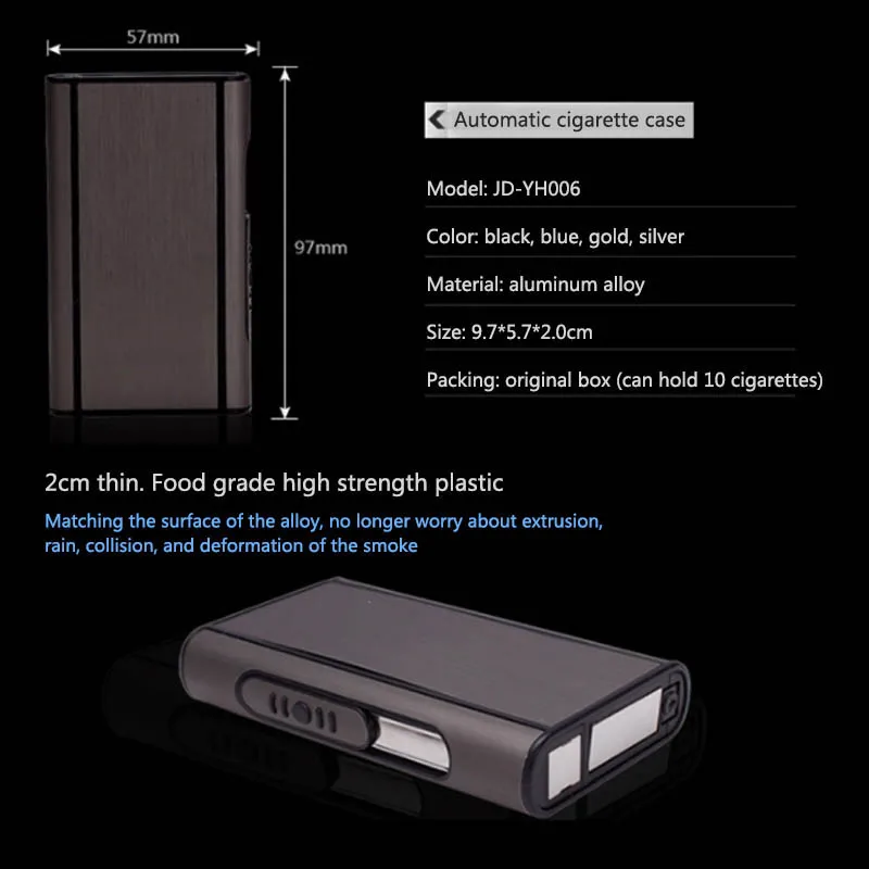 Изготовлен из высококачественного алюминия, прочный и долговечный. Внешняя крышка окрашена тщательно и легко царапается и царапается. Он может хранить 10 сигарет, помогая вам контролировать количество сигарет, которые вы курите. Сигареты выскочат сверху автоматически, сдвинув боковой переключатель. Портативный дизайн, удобно носить с собой. Эффективно удерживает сигареты от влаги и плесени.Материал: алюминиевый сплав
