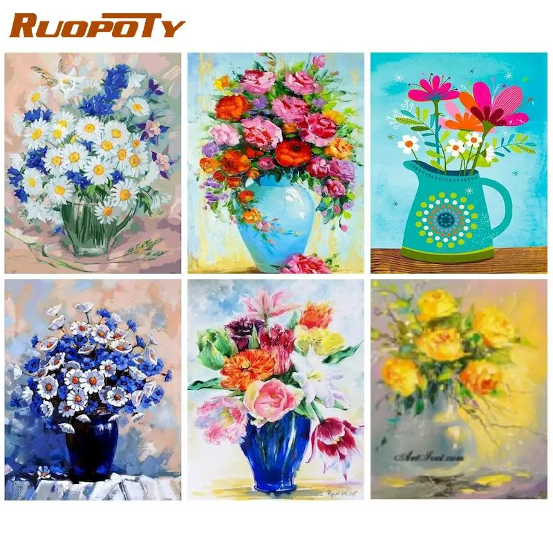 RUOPOTY Раскраска по номерам, желтые цветы, рисование на холсте, ручная роспись, искусство, подарок, DIY картины по номерам, вазы, наборы для дома