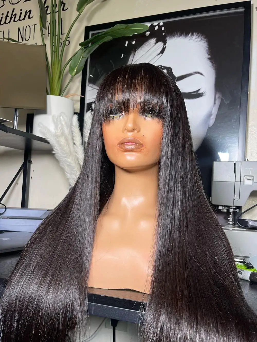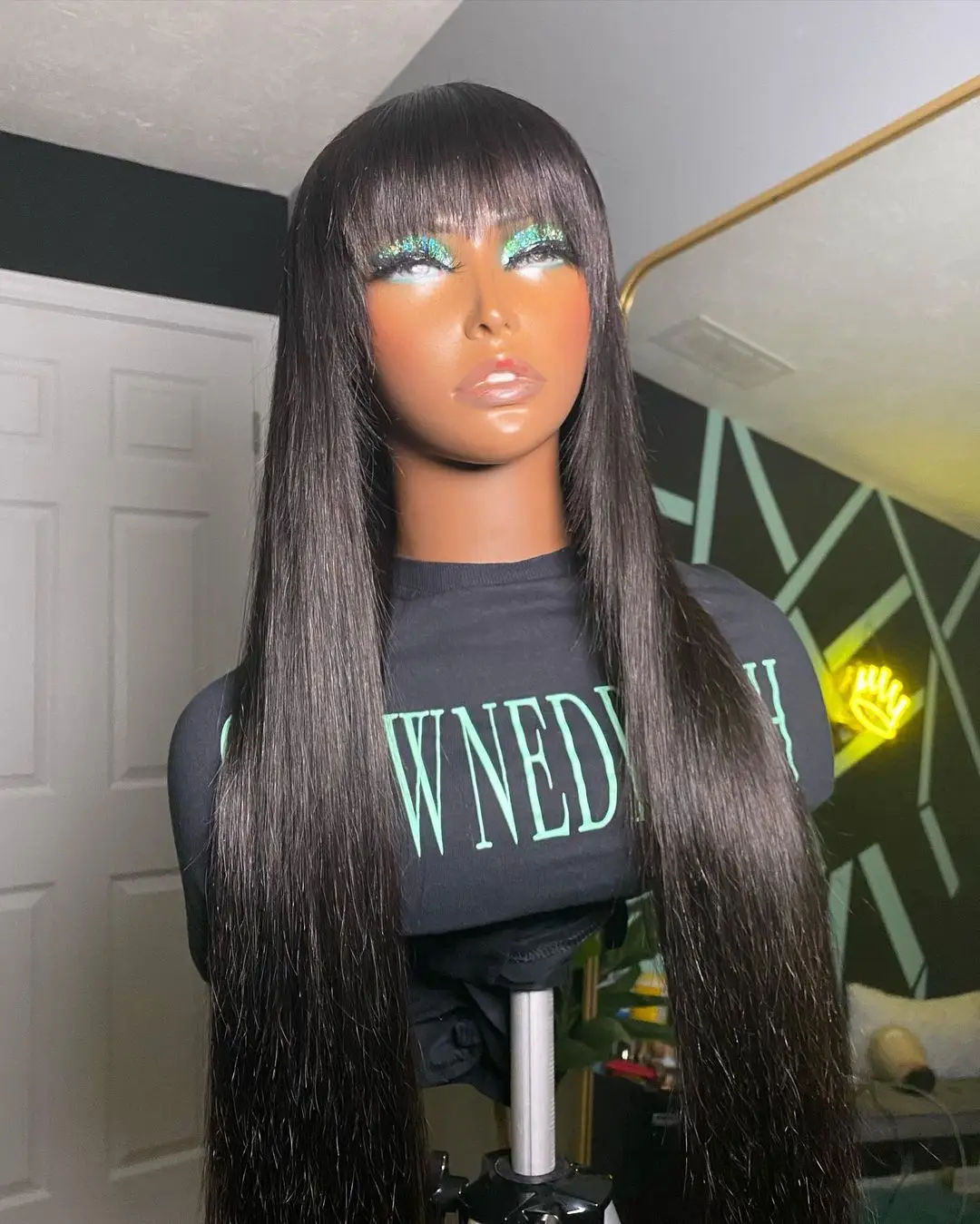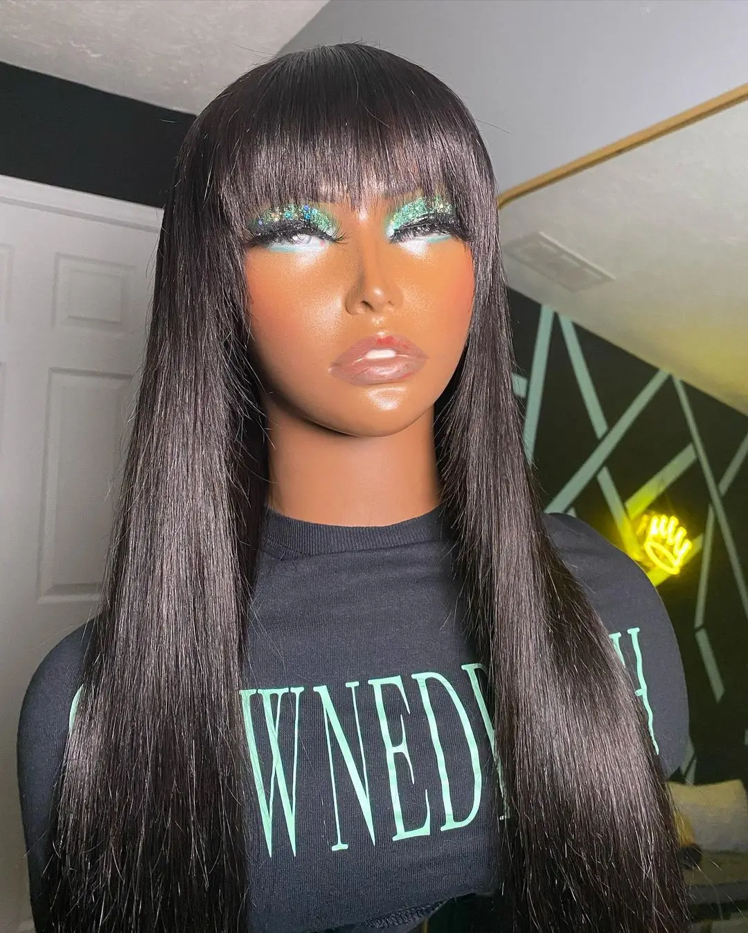 Прямой парик с челкой, парик из человеческих волос с челкой для женщин, бразильские волосы без клея, полностью машинное изготовление с челкой