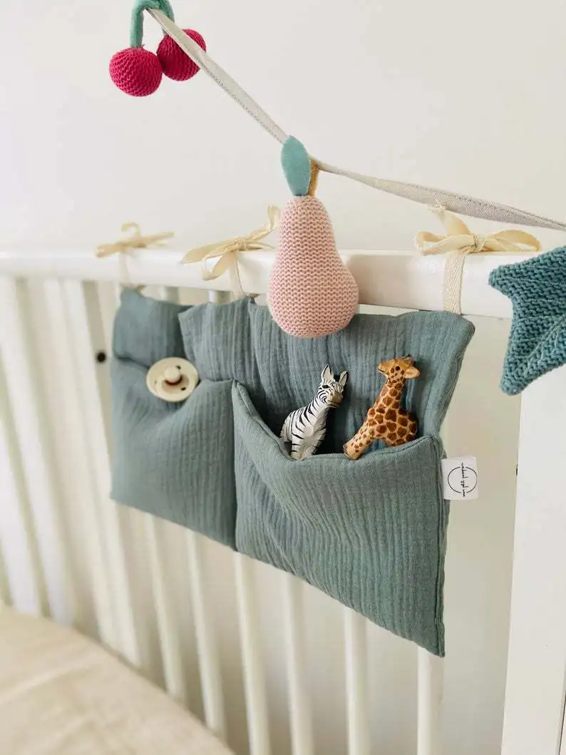 Подвесное белье для детской кроватки сумка для хранения подходит для подгузников, пустышек, прорезывателей, детских салфеток, подгузников или маленьких игрушек и т. Д. Вы также можете хранить там игрушки, книги или все, что хотите.