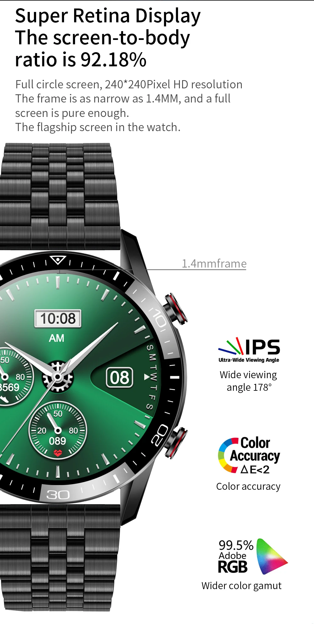2022 Новые Bluetooth подключение приложение телефон часы для совершения и приема звонковСенсорный экран: Полное сенсорное управлениеРазрешение: 240*240 pxТип батареи: полимерная литиевая батареяЕмкость аккумулятора: 320 мАВремя зарядки: около 60 минутВремя работы: 5-7 дней (в соответствии с привычками личного пользования)Время работы в режиме ожидания: около 15 днейЧехол и ремешок материал: нержавеющая сталь (не беспокойтесь о ржавчине, выцветании) + ТПУ/кожа на выборОсобенности продуктаОсновная функция приема/отклонения телефонных звонков/телефонных звонковМониторинг сердечного ритмаМониторинг кровяного/кровяного давления кислорода