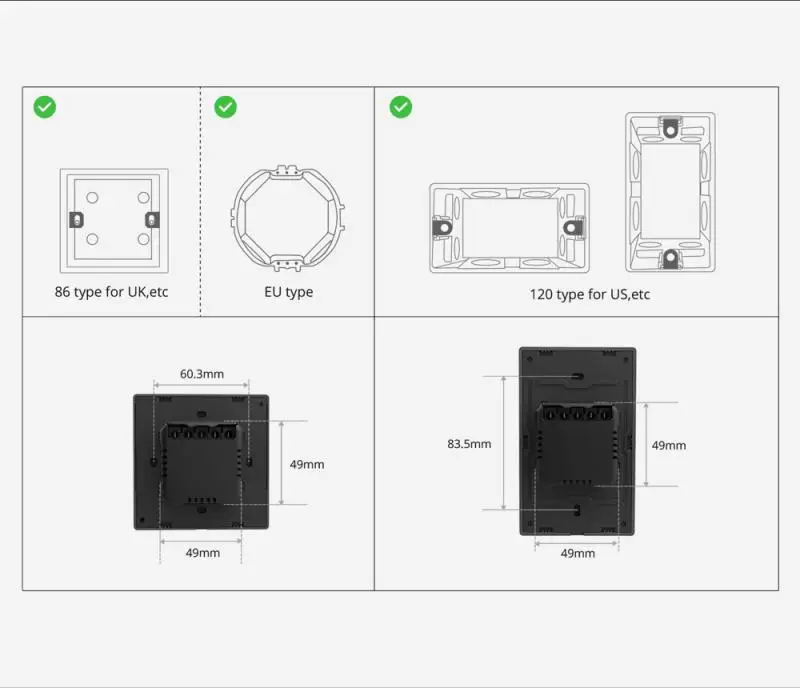 -- Близкое расстояние: удобное сочетание сенсорной панели HMI smart и двухканального настенного выключателя. Подходит для управления на близком расстоянии от яркости, комнатной температуры и многого другого.-Среднее расстояние: супер умное и чувствительное Голосовое управление для домашней автоматизации через Alexa, Google Assistant или Alice.-- Дальние расстояния: умный Контроль вашего дома через приложение eWeLink с его многонациональными функциями даже на открытом воздухе.