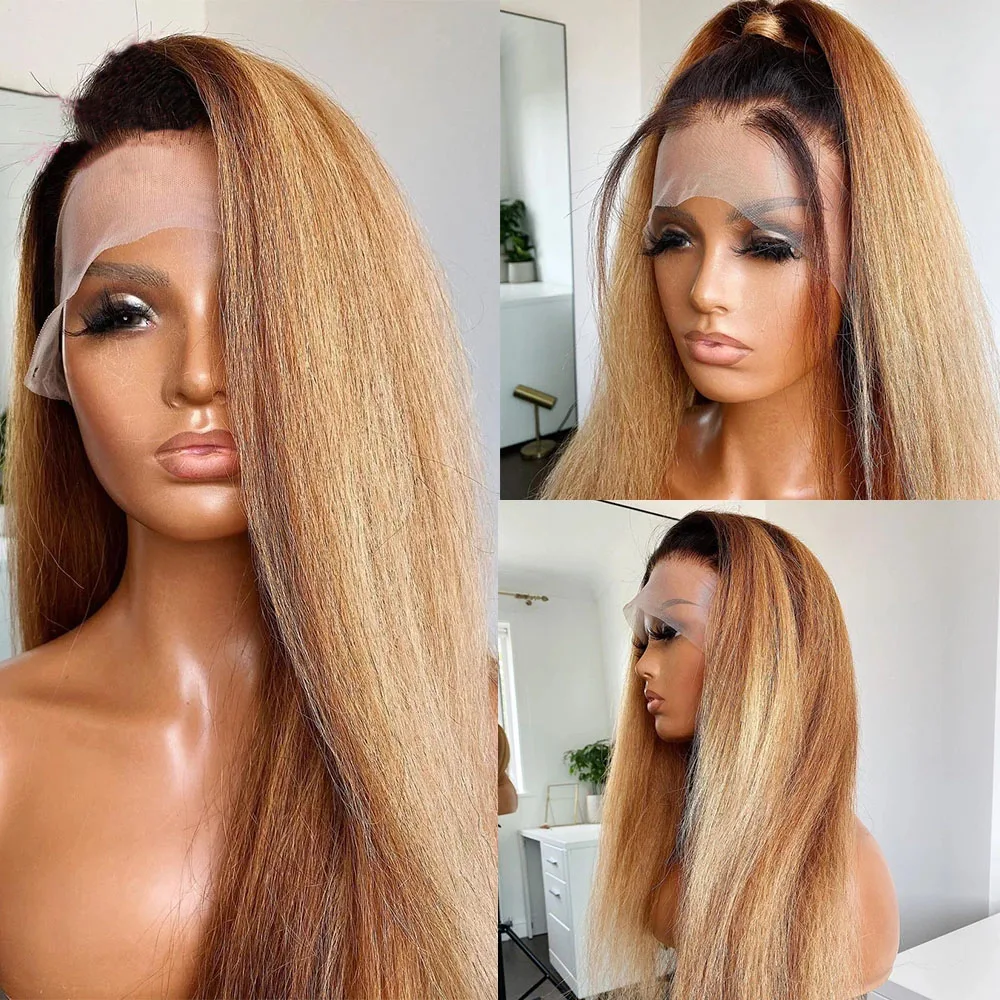 Прямой парик Омбре ярко-светлый хвост Yaki, искусственный парик без клея с искусственными волосами 13x6