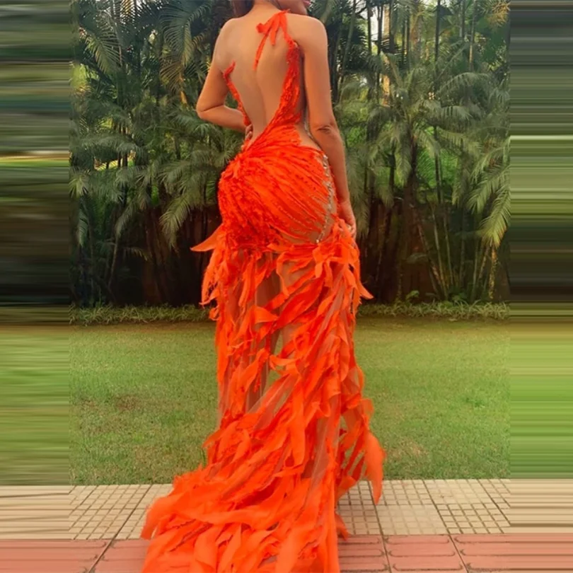 Женское вечернее платье в стиле бохо, оранжевое платье с искусственными перьями на заказ, богемное платье для вечерние ривечерние, платье русалки и страуса
