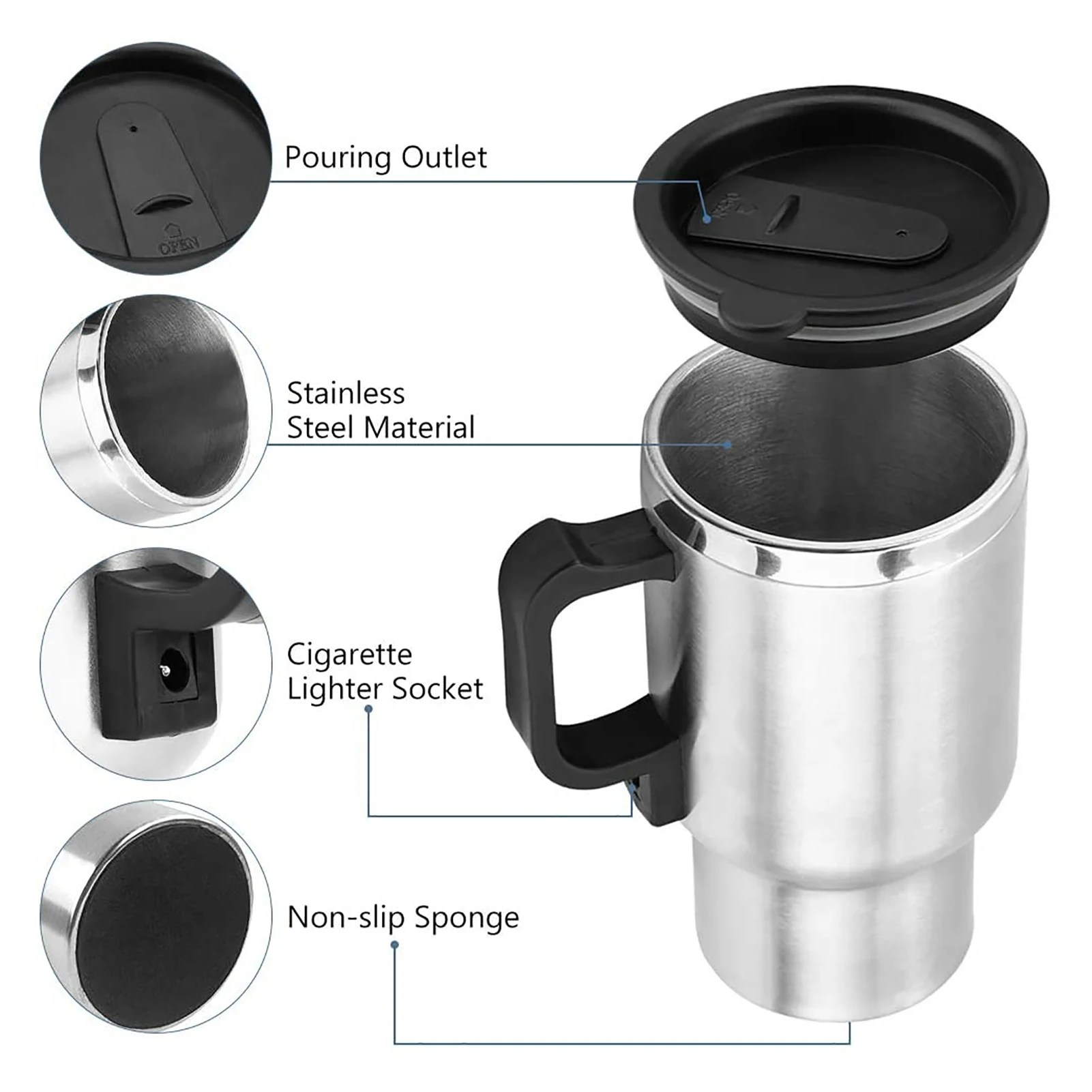 1. Он может быть вставлен в прикуриватель для путешествий объемом около 450 мл, который очень подходит для использования во время путешествий с семьей, а также есть хороший Электрический термос, подходит для походов в поход, чтобы сохранить кофе в тепле. Электрический чайник, работающий от прикуривателя постоянного тока 12 В, источник питания, подходит для электромобиля 12 В, может пить кофе, молоко, чай в дороге.2. Приклад сигарет в кофейной чашке разработан из высококачественной нержавеющей стали 304 и пищевого полипропиленового материала, который безопасен для питья кипятком. Крышка герметичного чайника изготовлена из высококачественного силикона, который безопасен и не является. Хорошая герметизация сохраняет воду в тепле и гарантирует, что напиток не будет переливаться.3. Внутри и снаружи прикуривателя для путешествий используется технология вакуумной изоляции, а двухслойная вакуумная изоляция обеспечивает максимальное сохранение горячих напитков с хорошим изоляционным эффектом и предотвращает обжигание. Автомобильный подогреватель чашки кофе подходит для большинства автомобильных подстаканников и очень подходит для путешествий.4. Инвертирующий светильник для кофейных чашек имеет дизайн индикатора, чтобы понять рабочий статус электрической чашки. Простой в использовании, просто Налейте чашку в воду и используйте кабель прикуривателя для подключения к машине через источник питания 12 В5. Нагревательный стаканчик для путешествий может быть подключен к любому стандартному прикуривателю 12 В с прилагаемым адаптером 12 В. Длина шнура питания составляет около 128 см/50,39 дюйма, который может использоваться в большинстве автомобилей, жилых домов, прицепов, RVs и автомобильных домов.Примечание:Эта чашка не может кипятить воду! Это удерживает оригинальный теплый напиток при определенной температуре (только сохранение тепла) и не может достичь функции нагрева напитка до кипения.Спецификация:Материал: нержавеющая стальОсновной цвет: серебристый (как показано на изображении)Напряжение: 12 В постоянного тока (автомобильная Зажигалка)Температура нагрева: около 60 °C, 15 минутЕмкость: около 450 млВес: около 300 гРазмеры: около 13*17*9,3 см/5,12*6,69*3,66 дюймов (в том числе упаковка)Размер одной чашки:Общая длина: около 16 см/6,30 дюймаДиаметр бутылки: около 8,7 см/3,43 дюймаВнутренний диаметр: около 7,8 см/3,07 дюймаНижний диаметр: около 6,7 см/2,64 дюймаОбщая длина: около 128 см/50,39 дюймаПосылка:1 * нагревательная чашка