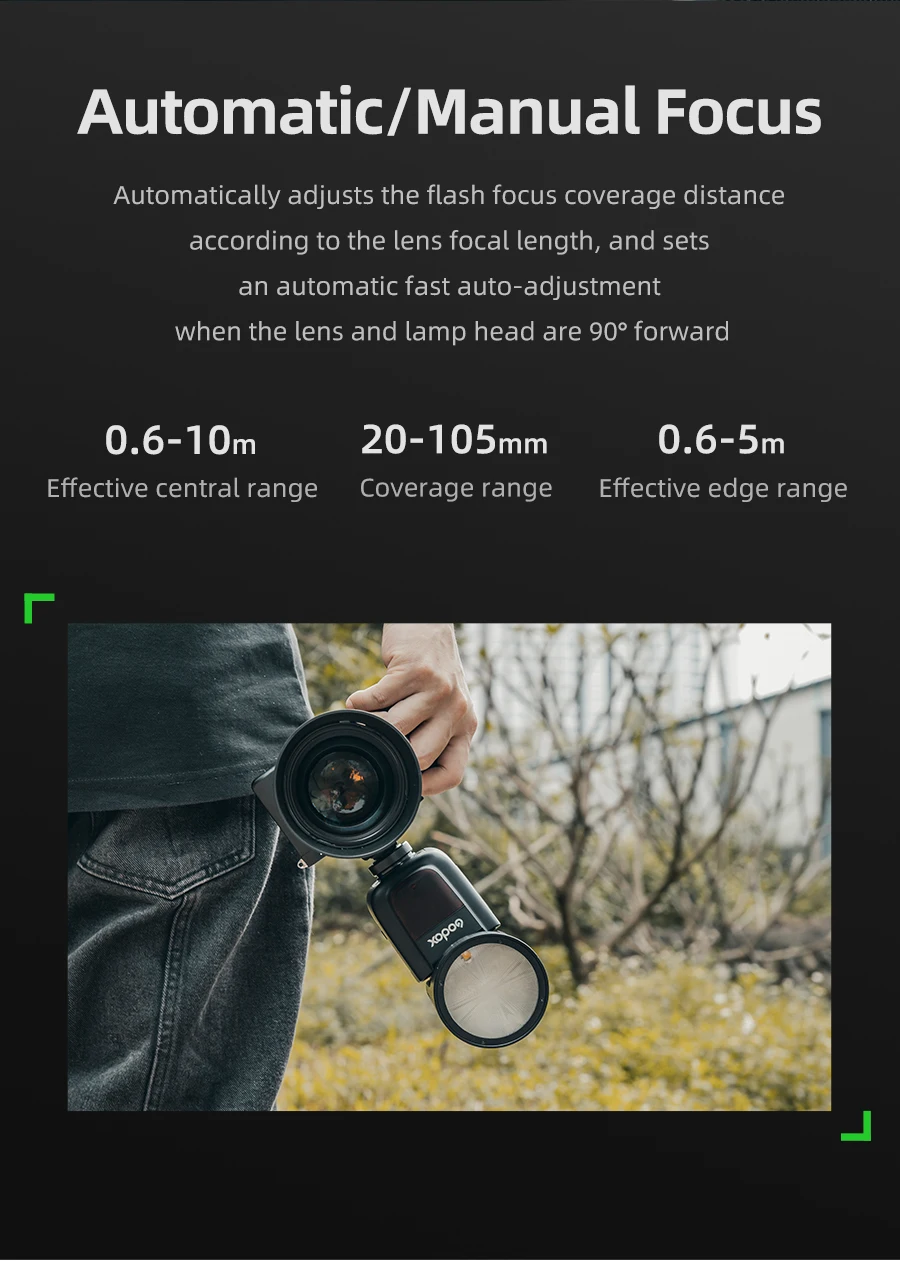 Godox V1 оснащен круглой головкой вспышки, чтобы предложить студийный мягкий и ровный светильник.