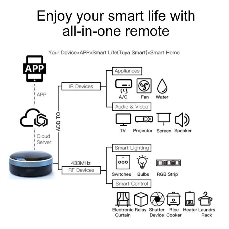 Пульт дистанционного управления бытовой техникой на мобильный телефон. На улице или в компании, вы можете использовать приложение Tuya для удаленного управления бытовой техникой. Например: Включите кондиционер по дороге домой и автоматически выключите занавес (433) ночью.