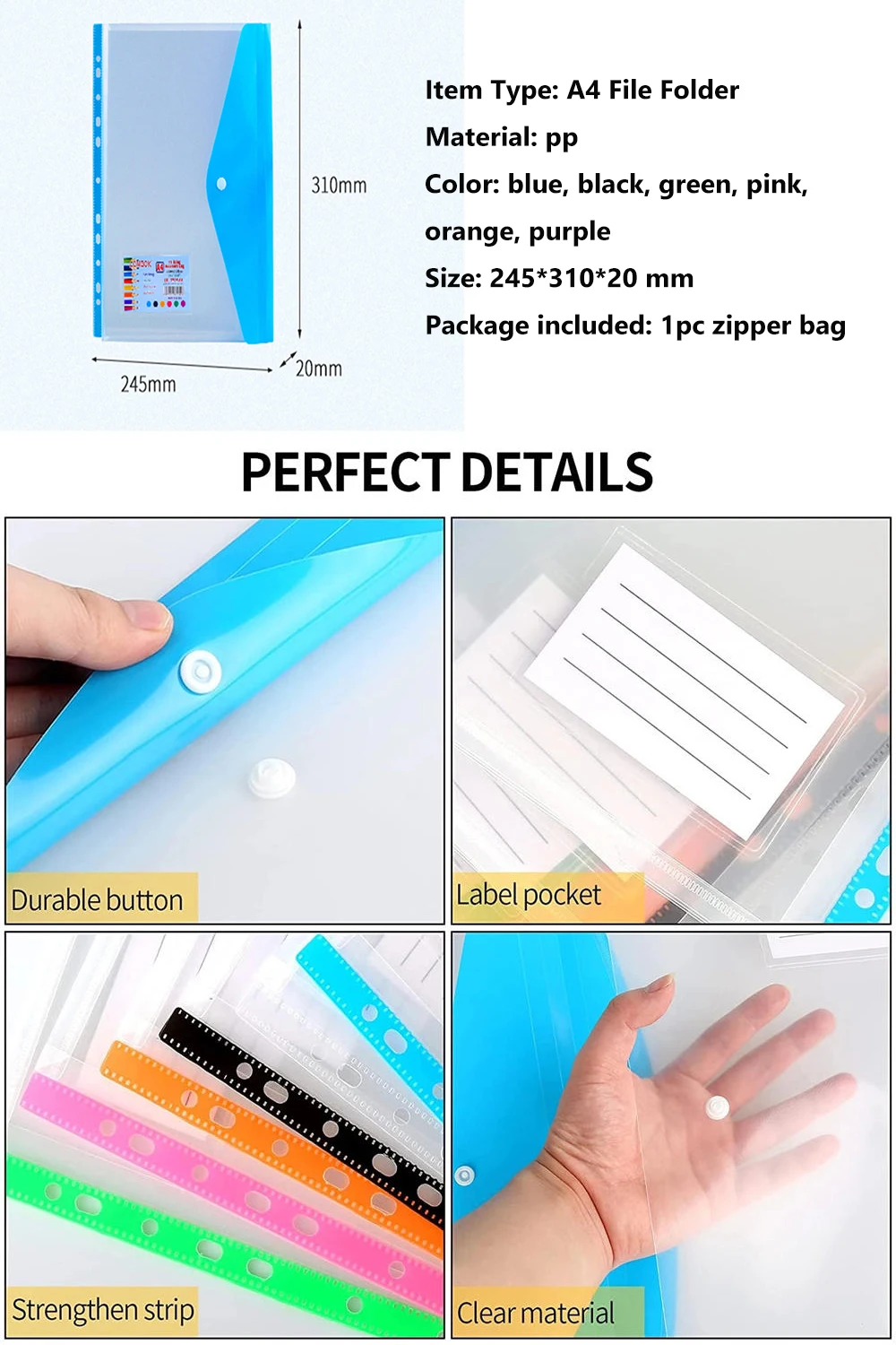 Особенности:Высокое качество: Изготовлен из высококачественного пластика, прозрачной и яркой поверхности, толстый и прочный, нетоксичный и без запаха, с профессиональным качеством.Карманы: подходит для стандартных колец 2/3/4, они могут содержать около 60 листов в удобном и организованном стиле. Застежка-липучка для защиты ваших листов бумаги.Тип товара: папка формата А4Материал: полипропиленЦвет: синий, черный, зеленый, розовый, оранжевый, фиолетовыйРазмер: 245*310*20 ммПосылка включает в себя:1 шт. сумка на молнии