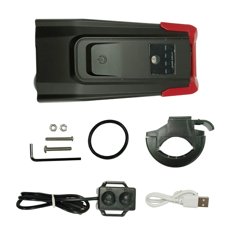 Размер: 10,8*5,2*4,4 смЦвет: черный, синий, красныйМатериал: АБС-пластикРеальные 800 люменовВстроенный аккумулятор 4000 мАчДвойные лампы T6Сенсорный Водонепроницаемый выключатель питанияIPX6 ВодонепроницаемыйВстроенный дБ колоколКабель колокольчика: 40 смПерезаряжаемый USB