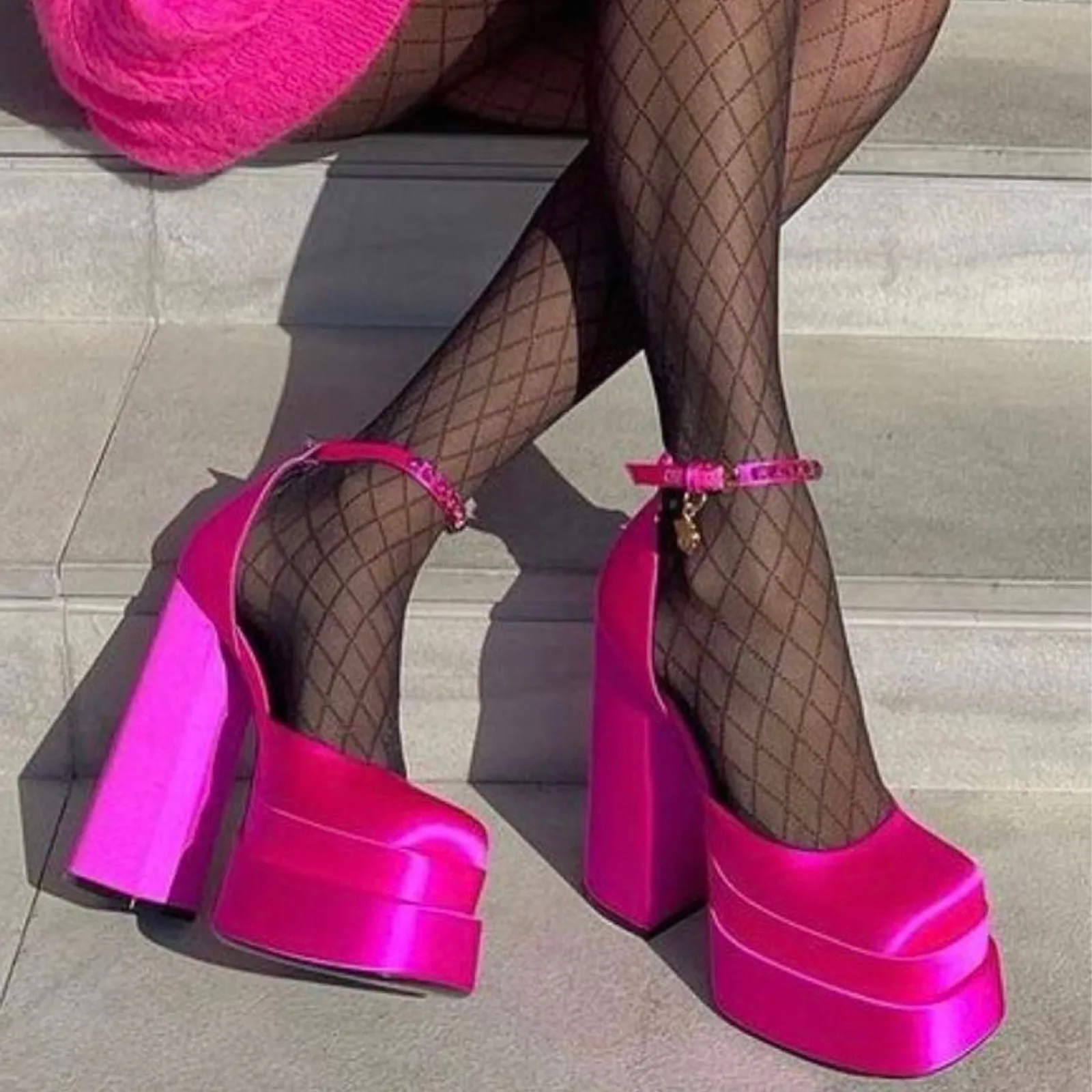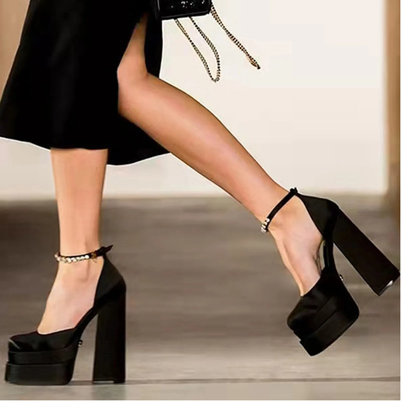 Туфли женские атласные на платформе, однотонные туфли-лодочки на толстом высоком каблуке, с пряжкой на щиколотке, квадратный носок, модные, #35