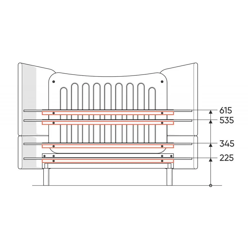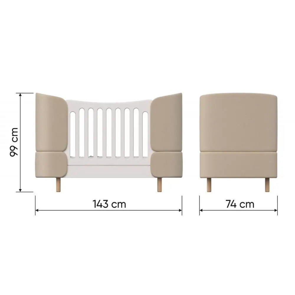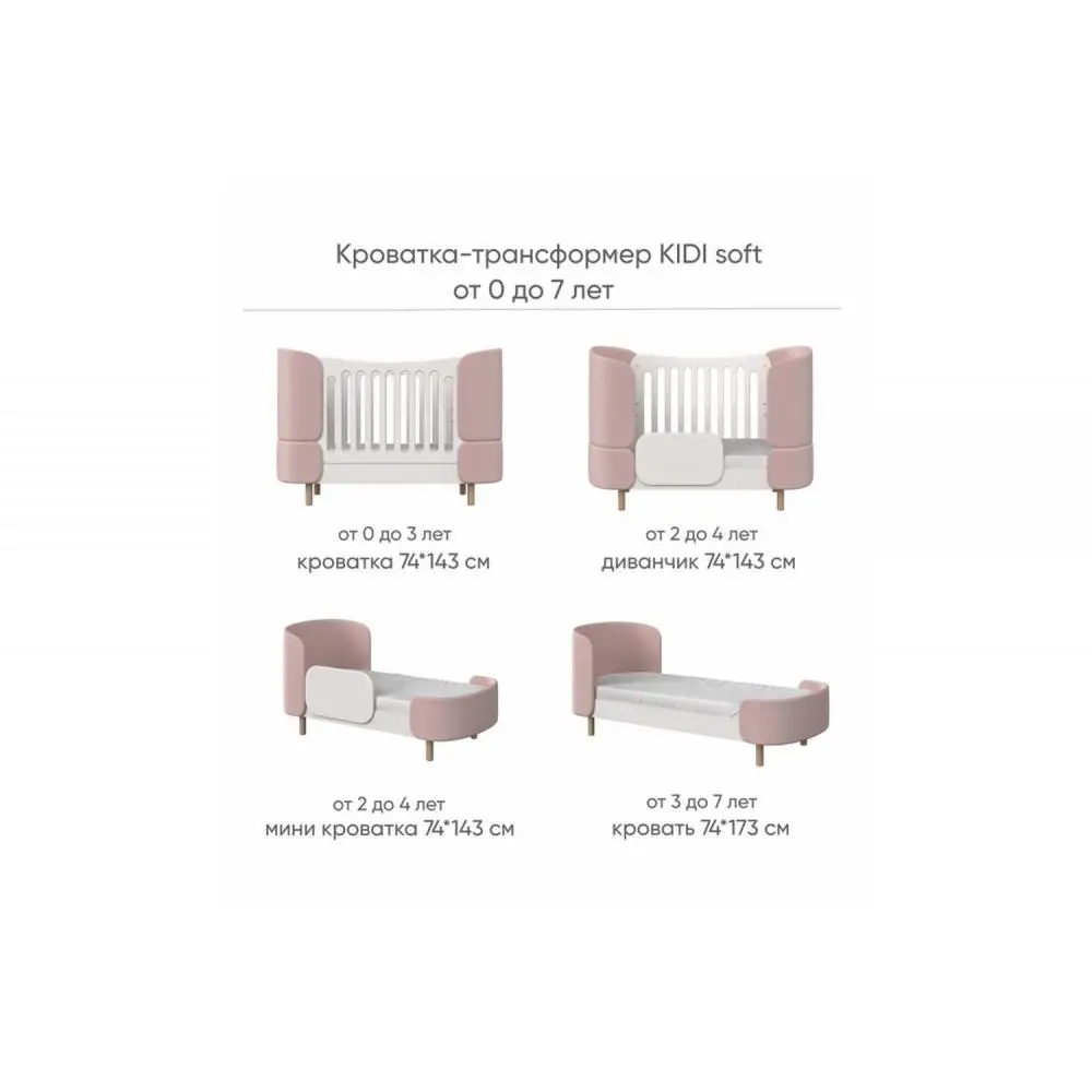 Кроватка-трансформер Kidi soft с мягкими текстильными спинками имеет увеличенный размер спального места, что позволяет использовать кроватку даже в базовой комплектации до 4 лет.