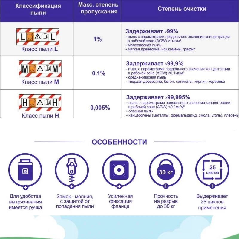 - многослойный нетканый материал,- высокая степень фильтрации, класс пыли "L",- прочный и износостойкий,- сохраняет мощность всасывания,- водостойкий, можно собирать влажный мусор и воду.