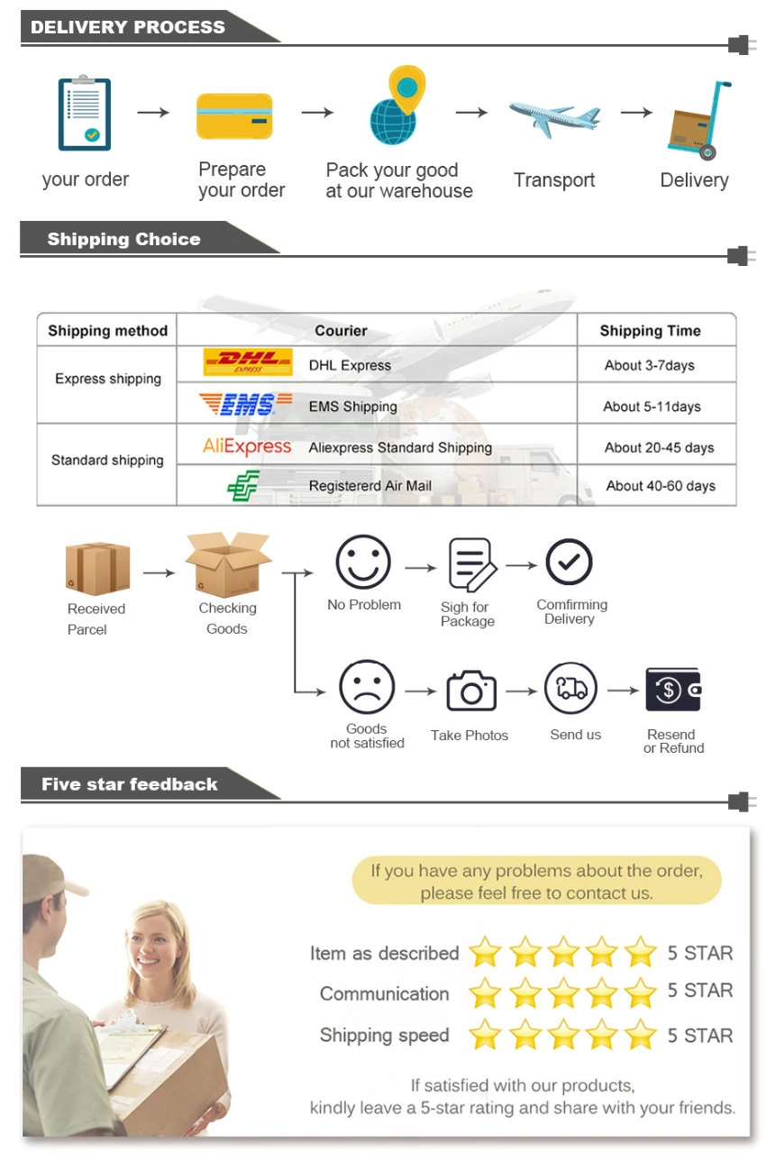 6.Ожидаемая дата доставки будет зависеть от таможни, погоды и т. д., иногда это может занять немного больше времени, чтобы получить,Пожалуйста, свяжитесь с нами, когда вы не получили посылка, чтобы продлить срок защиты вашего заказа.