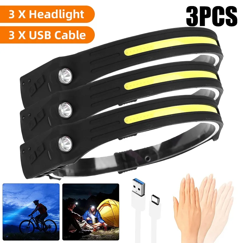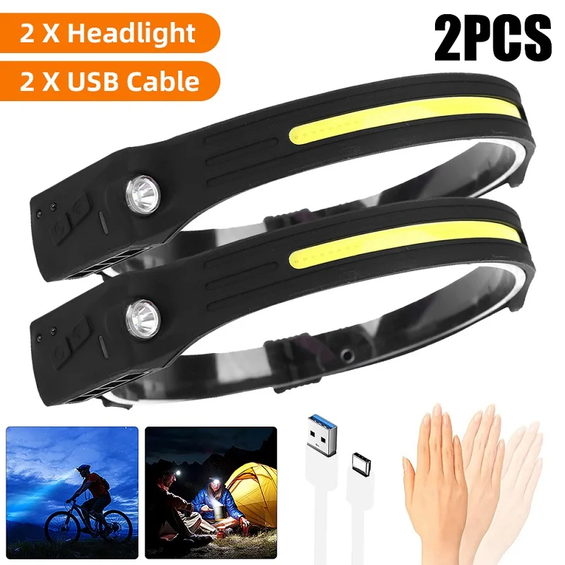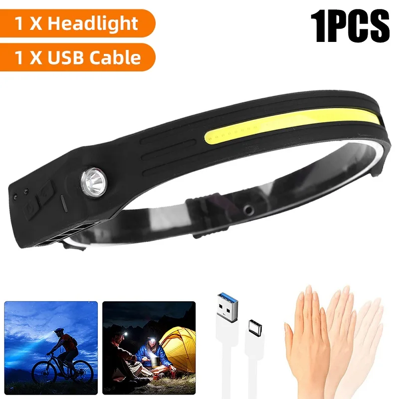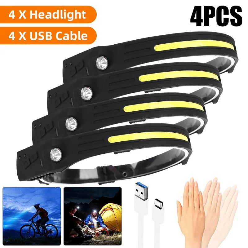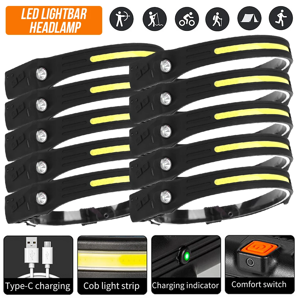 Налобный фонарь с COB матрицей, Головной фонарь светодиодный с датчиком, зарядка через USB, 4 режима, налобный фонарь для рыбалки, 1-10 шт.