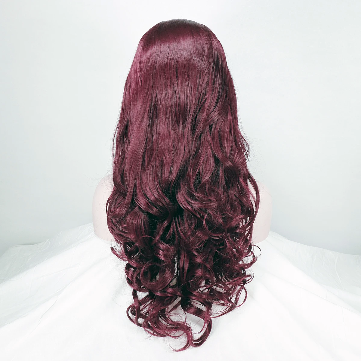 Бесклеевой 26 дюймов длинный волнистый бордовый 180 плотность синтетический 99j кружевной передний парик для черных женщин детские волосы глубокая часть предварительно выщипанный