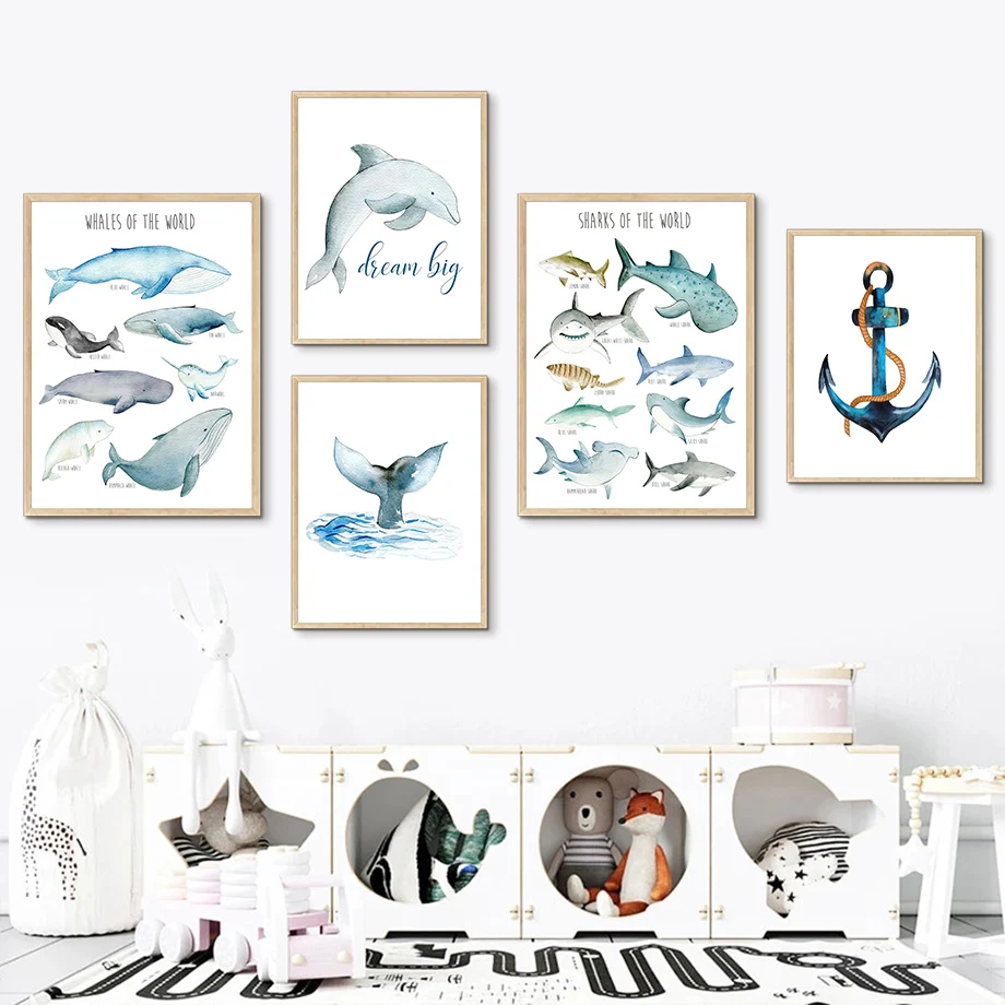 Океанский КИТ, Акула, дельфин, якорь, компас, настенный арт, холст, живопись, скандинавские плакаты и принты, настенные картины, декор для детской комнатыМатериал: экологически чистый хлопокХарактеристика: солнцезащитный, водонепроницаемый, никогда не выцветает