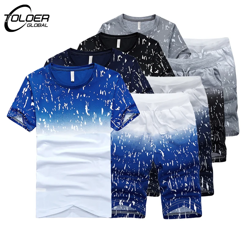 Костюм спортивный мужской из 2 предметов, тонкий дышащий, короткий рукав + шорты, футболка, синий градиент, повседневные шорты, на лето