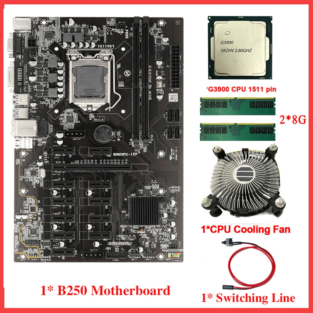 Набор материнской платы B250 BTC для майнинга LGA 1151 G3900 CPU 12 USB3.0 до PCIE слот GPU 816 ГБ 2133 МГц DDR4 для 12 процессоров