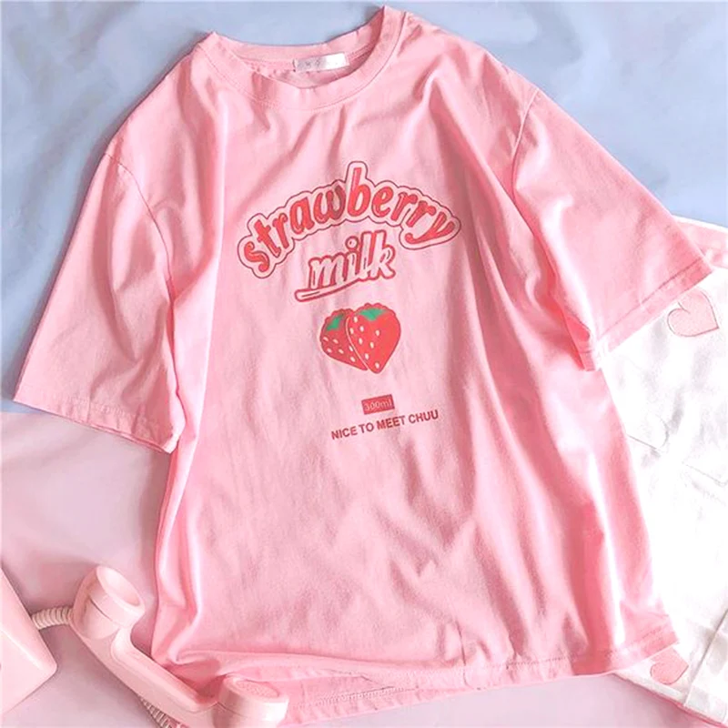 Кавайная Милая Клубничная молочная мультяшная графическая розовая Милая летняя уличная одежда для девушек Повседневный Топ в японском стиле INS Повседневная винтажная женская футболка