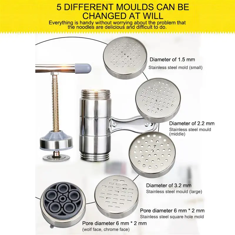 5 пресс-форм, ручная машина для изготовления лапши, пресс для макаронных изделий, машина для изготовления лапши-спагетти, нержавеющая сталь, резак для фруктов, соковыжималка, кухонный инструмент