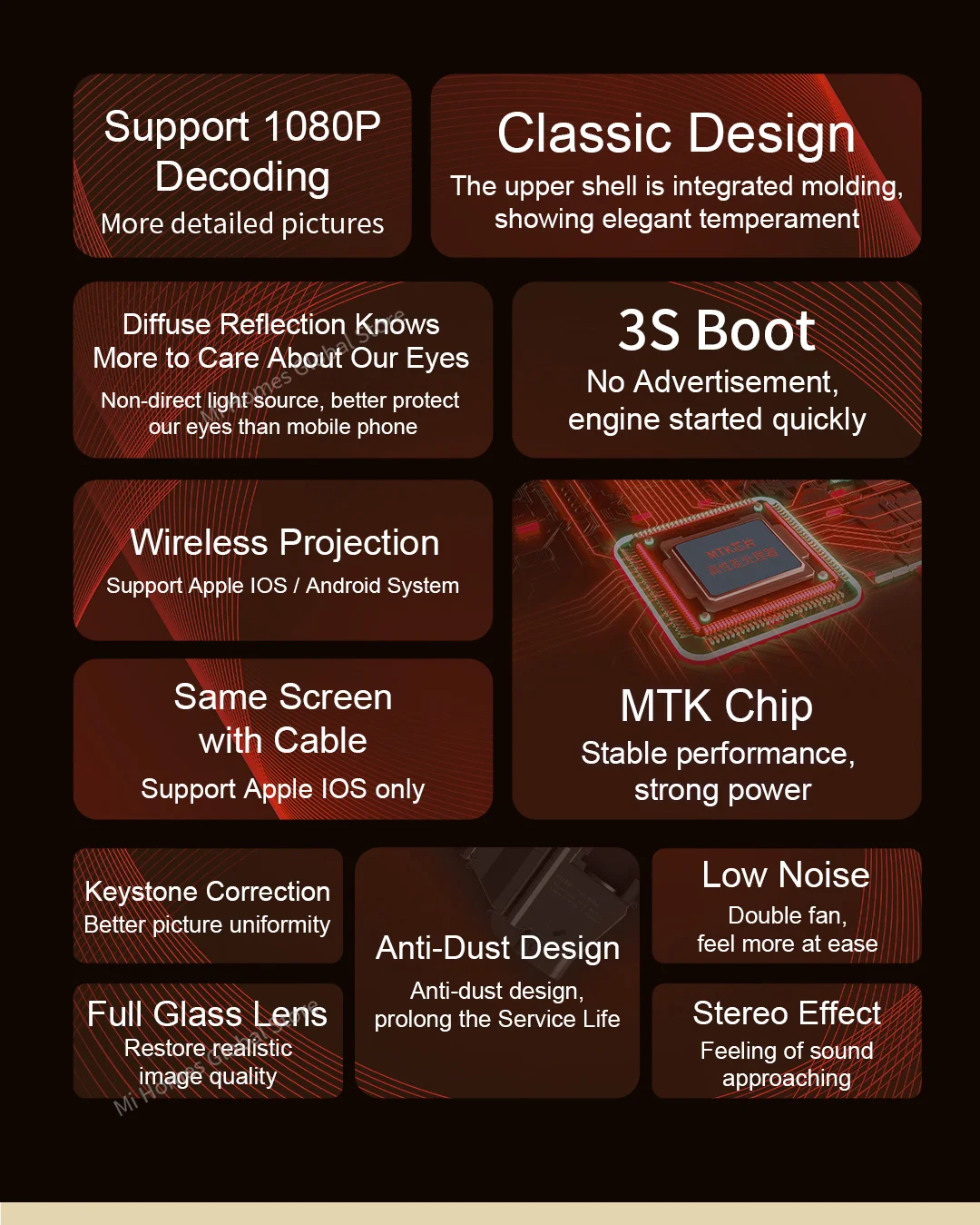 Поддержка устройств I OS и iPad, HD просмотр не ограничен, и восстановление реальных и великолепных цветов. Мобильный телефон выбрасывает изображение и делает все, что вам нужно.