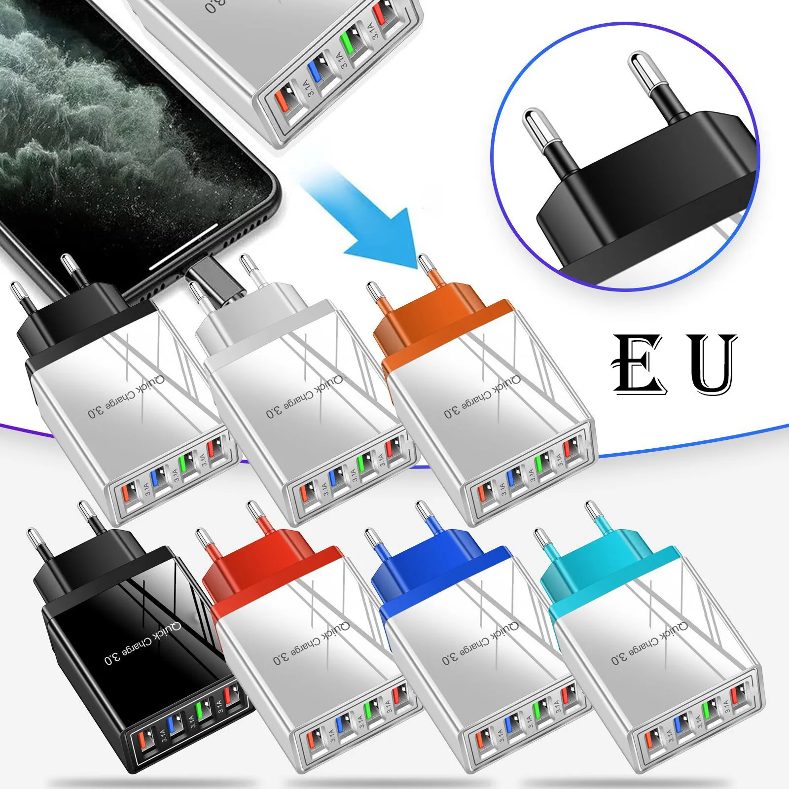 Цветной 4USB мобильный телефон зарядное устройство 3A плоская дорожная зарядная головка зарядное устройство/EU