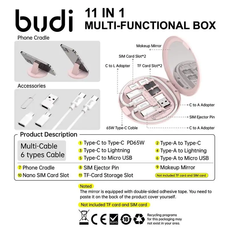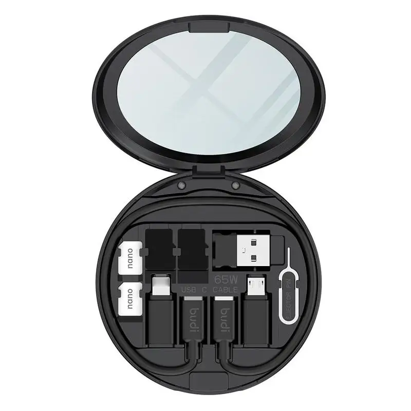 Удобный для путешествий дизайнМногофункциональная коробка представляет собой маленький размер в ладони, в измерениях составляет83x83x9,6 мм этот компактный и может быть легко заправить в вашей сумке сзадиКарман, сумка для гаджетов, сумка, рюкзак, чехол для игровой консоли, ноутбукЧехол или сумка для планшета. Идеально подходит для путешествий и деловых поездокЗеркало для макияжаОткройте крышку коробки. ТамЗеркало за крышкойВечерние ли вы, путешествияИли отправляйтесь на пикник, вы можете носить с собойЭто! Зеркало оснащеноДвусторонняя клейкая лента.Вам нужно вставить его наЗадняя часть чехлаСамостоятельноДержатель для телефонаДолгий полет? Фильм? Свободные руки?Одна секунда для настройки многофункционального budiКоробка в качестве колыбели для телефона. Что вы можете смотретьФильм на вашем телефоне без рук1 шт. USB C к USB C кабель. Поддержка PD зарядкиИ кабель быстрой зарядки (поддерживает 65 Вт)Тип адаптераАдаптер USB A-USB C BUSB C B к адаптеру Micro USBМногофункциональная коробка budi-революционный дизайнКоторая объединяет все основные и наиболее частоИспользуемые кабели Разъемы; Около 29 см Тип CКабель типа C с 3 адаптерамиДо 6 различных типов кабелейВключает: 1*11в1 коробка