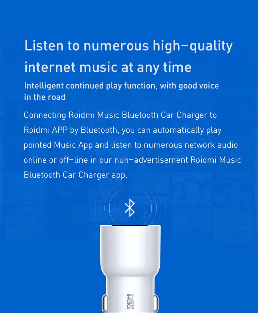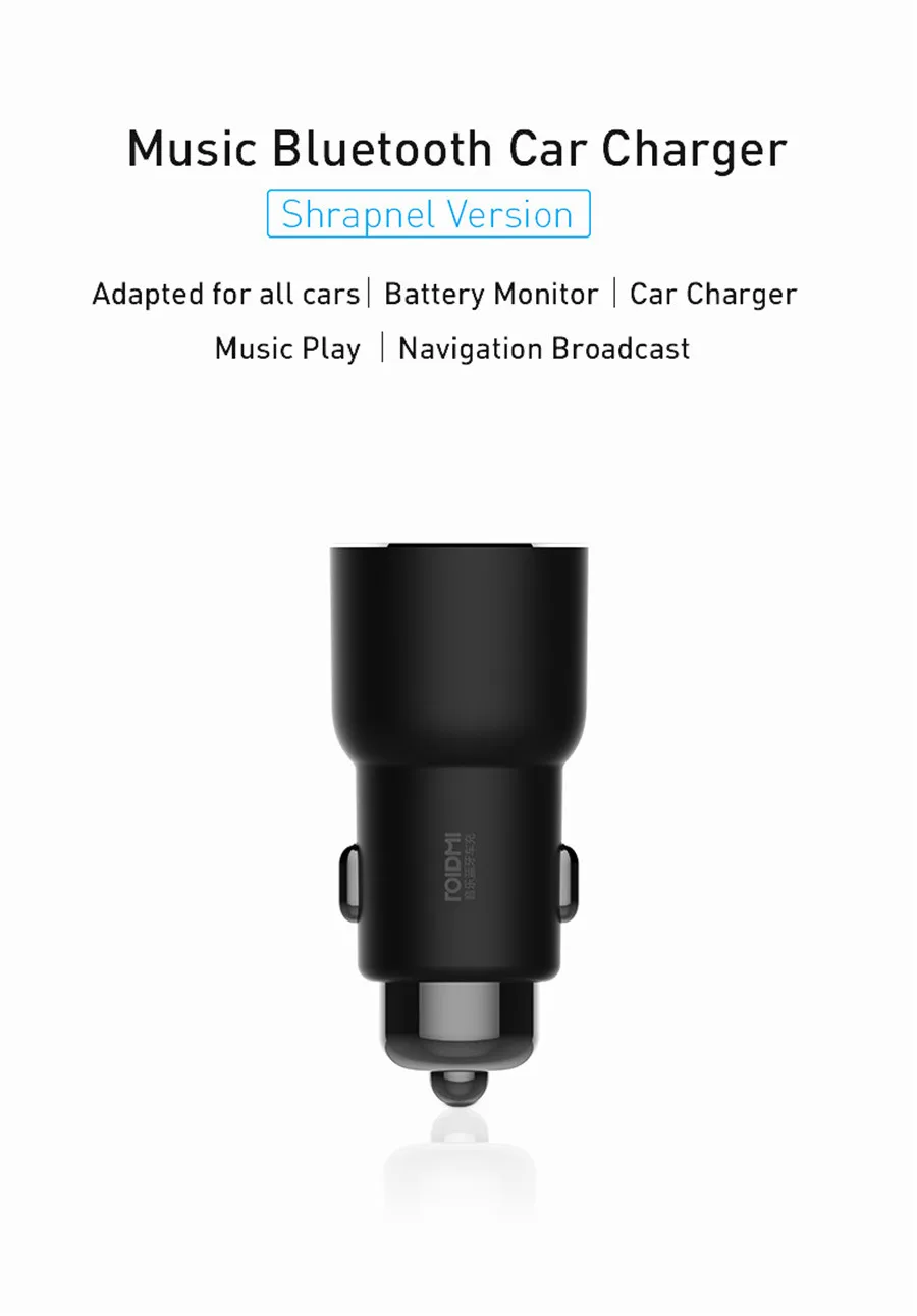 1.Два порта USB могут заряжать два устройства одновременно Интеллектуальное шумоподавление, HD звук для вас 2.3.4A Сетевое зарядное устройство с высокой производительностью, с коэффициентом конверсии до 95 процентов, заряжать устройства с высокой скоростью 3.Беспроводное соединение Bluetooth, один раз для подключения и автоматического перезапуска (название Bluetooth: Roidmi Music Blue C) 4.Можно слушать музыку с автомобильной стереосистемы после подключения к телефонам через Bluetooth (Отрегулируйте FM до 96,4 МГц, можете переключить ее как реальную ситуацию) 5.В режиме реального времени, чтобы контролировать напряжение, доставить тревожное сообщение, когда происходит Аномальная ситуация 6.Растягивающиеся железные детали для лучшего соединения и не легко отрезать 7.FM частота: 87,5-108,0 МГц