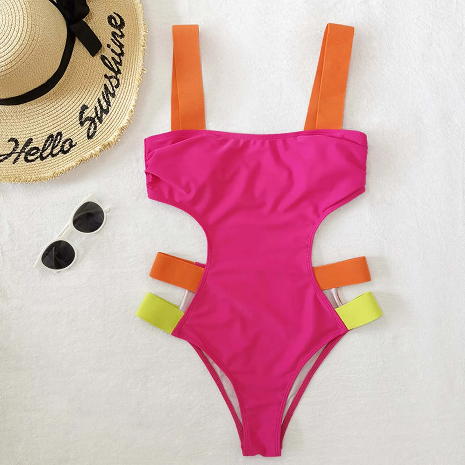 Женский слитный Купальник из двух предметов, флуоресцентный бандажный Купальник контрастных цветов с подкладкой на груди, 2022