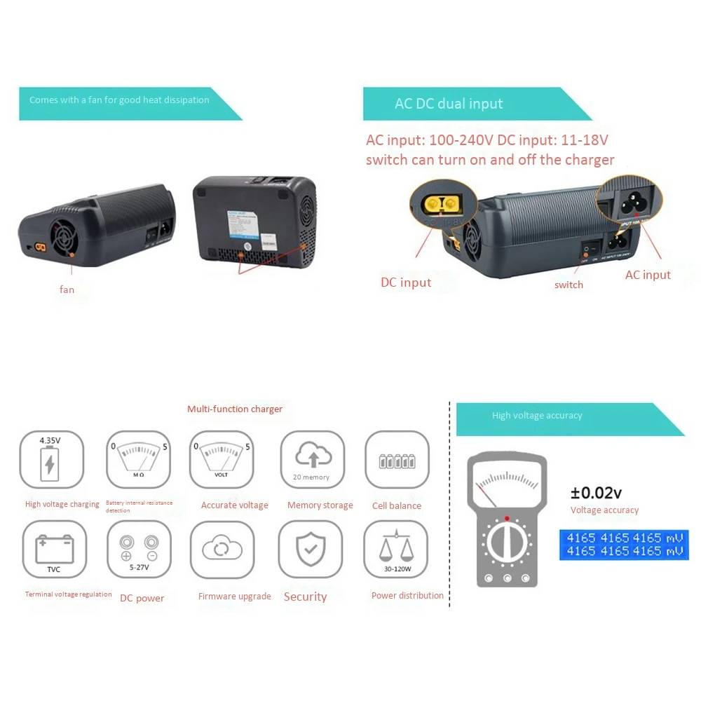 Вход: AC 100-240 В/DC 11-18 вМощность зарядки: режим переменного тока 150 Вт (CH1 + CH2 = 150 Вт), режим постоянного тока 120 Вт * 2 = 240 ВтМощность разряда: макс. 10 Вт * 2Диапазон заряда: 0,1-10A * 2Диапазон тока разряда: 0.1-2A * 2Количество ячеек Lilon/LiPo/LiFe/LiHV: 1-6 ячеек * 2NiCd/NiMH Количество ячеек батареи: 1-15 ячеек * 2PB Напряжение батареи: 2-20 в * 2Умная Батарея: I/II/III * 2Слив тока для балансировки: 500 мА/ячейкаТип штепсельной вилки: штепсельная вилка европейского стандарта, применяется в Индонезии, Германии, Франции, Испании, Италии и т. д.Цвет: черныйМатериал: пластик + металлРазмеры: 14,5x10,5x6,4 смПосылка:Зарядное устройство-1 шт.Посылка для аксессуаров-1 шт.1 х Руководство на китайском и английском языкахТолько вышеуказанная посылка, другие товары не включены.Примечание: светильник и различные дисплеи могут привести к тому, что цвет товара на картинке немного отличается от реального. Допускается погрешность в измерениях +/- 1-3 см.