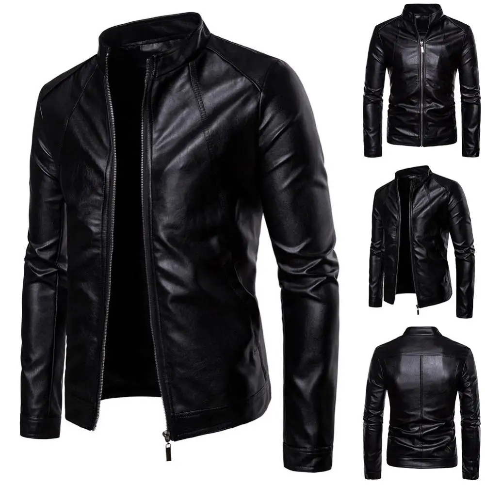 Мужская мотоциклетная куртка из искусственной кожи, однотонная куртка с длинным рукавом и воротником-стойкой, на молнии