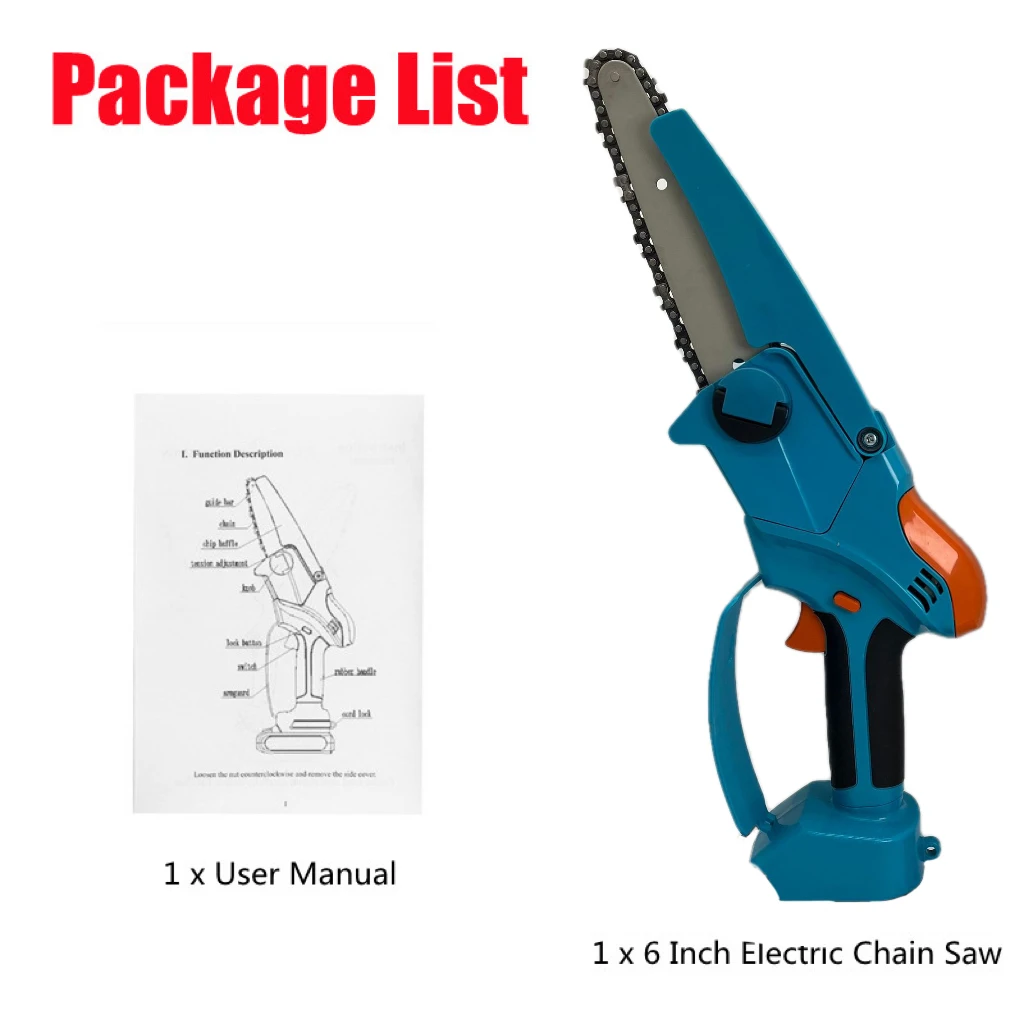 Упаковка включает:Модель 1: (без аккумулятора)1x6 дюймов Электрическая цепная пила1 x Руководство пользователя