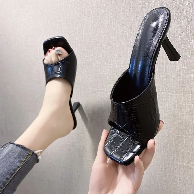 Летние новые сандалии с квадратным носком на среднем каблуке-шпильке, женская обувь, полутапочки, женская верхняя одежда, тапочки на высоком каблуке